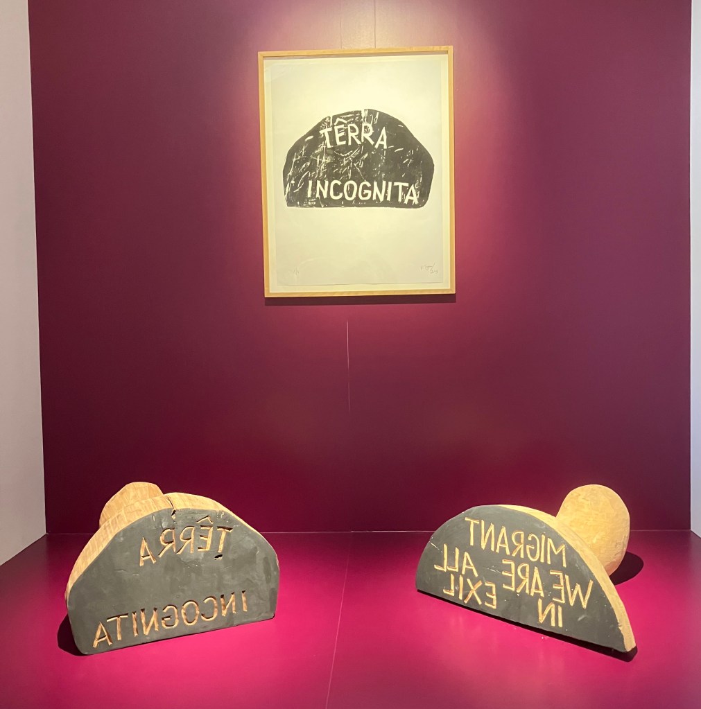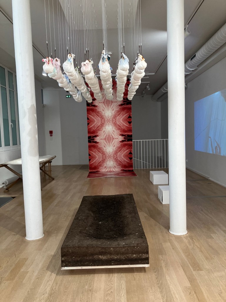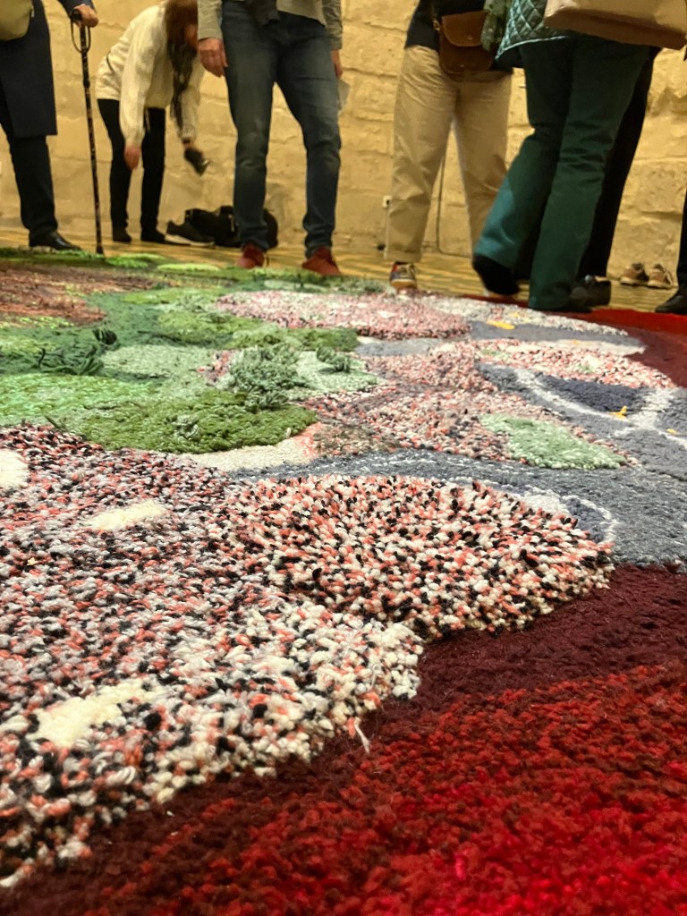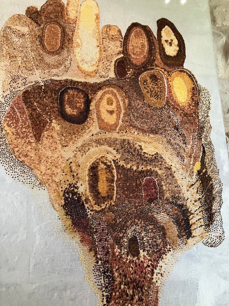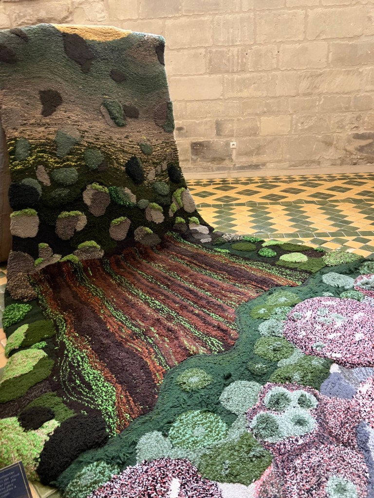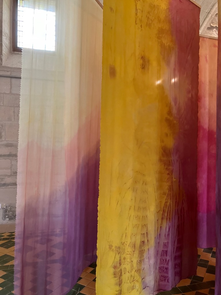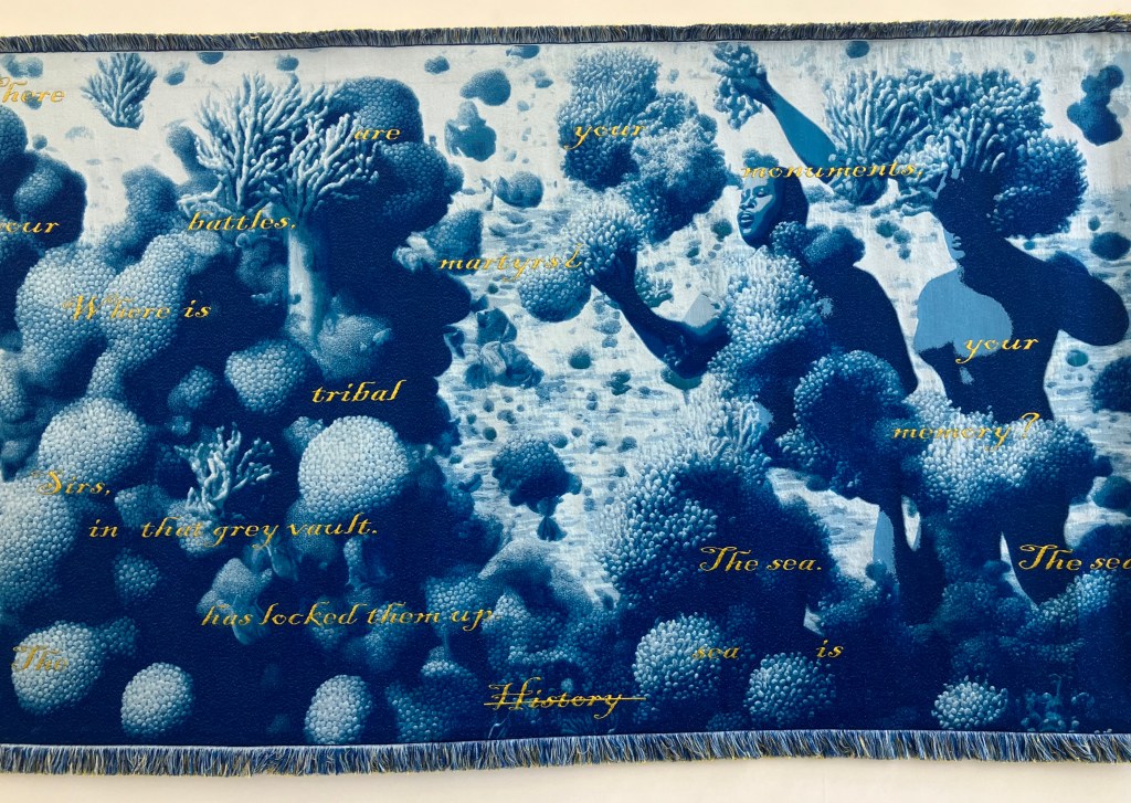 9- Dans la cour on peut entrer dans la galerie Mitterand , accueilli par des oeuvres textiles ( tissage Jacquard) de l’artiste pluri-disciplinaire Marc Johnson illustrant un poème de Derek Walcott the sea is history .