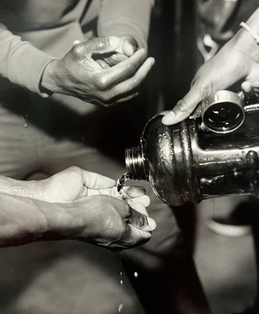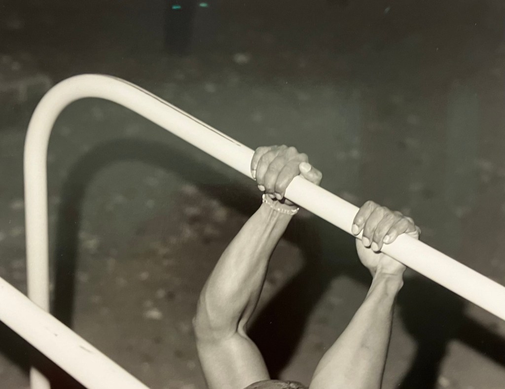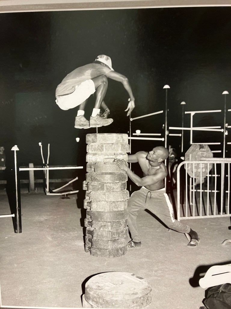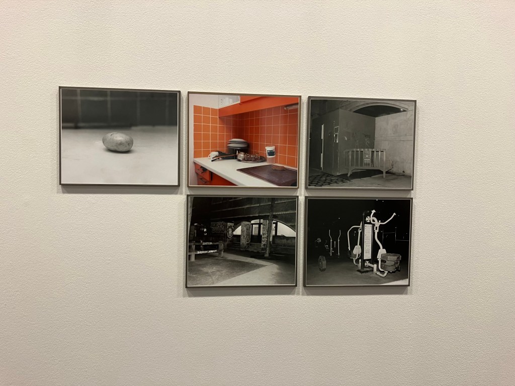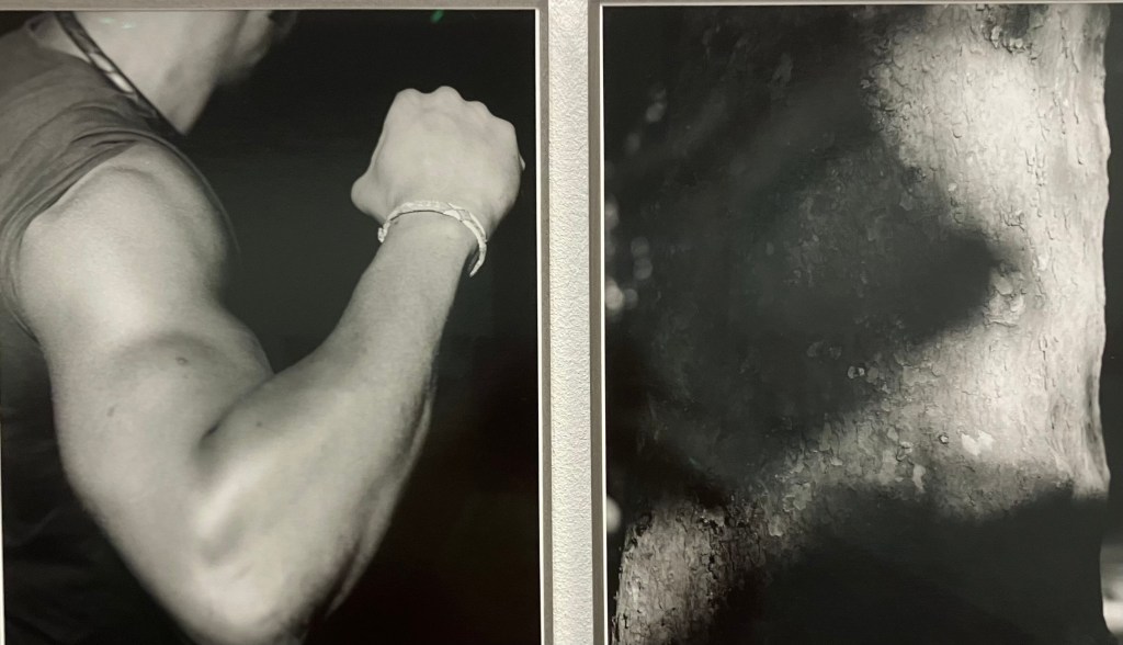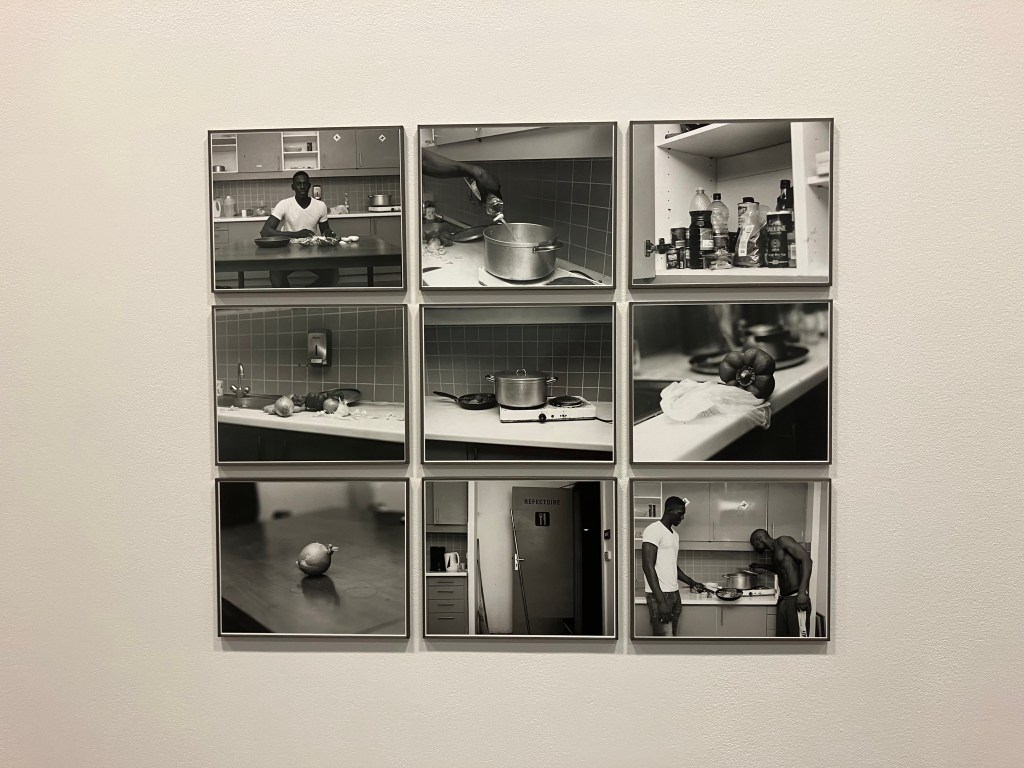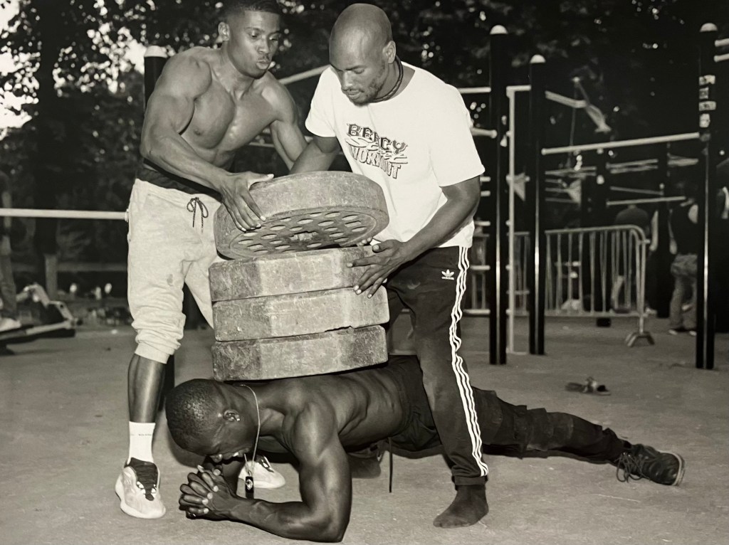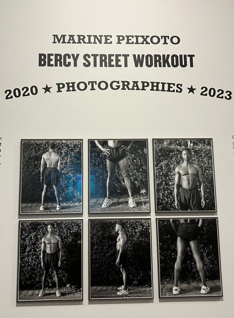 Là aussi il s’agit de recherches , la photographe découvre le parc de Bercy , puis peu à peu ces jeunes gens qui y pratiquent le street work out , musculation intensive en plein air , dans du mobilier urbain, gratuitement,callisthénie , et prend des photos en noir et blanc chaque jour à partir de 2020 , juste à la fin du confinement , travail encore en cours .Elle a reçu le prixle bal/Adagp. Sur 3500 photos , il a fallu faire des choix .Elle fait des portraits de groupe , des portraits rapprochés , des photos d’accessoires , de l’environnement , et classe cela par blocs , c’est elle qui a conçu l’accrochage . Pas de cartels , stars internationales avec millions de followers et pratiquants d’un jour sont traités anonymement , sur un pied d’égalité . Son protocole , un seul format , type A3, du noir et blanc , filmer le sport , l’effort « travail et discipline » , mais aussi quelques moments de relâchement , faire ses tirages elle- même de ses photos argentiques , être dans un autre esprit que ces sportifs qui bombardent les réseaux sociaux de photos de leurs muscles .