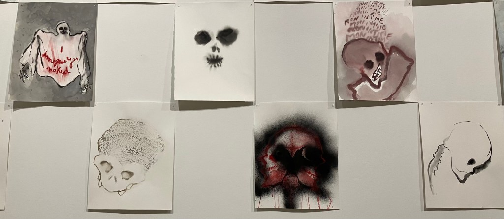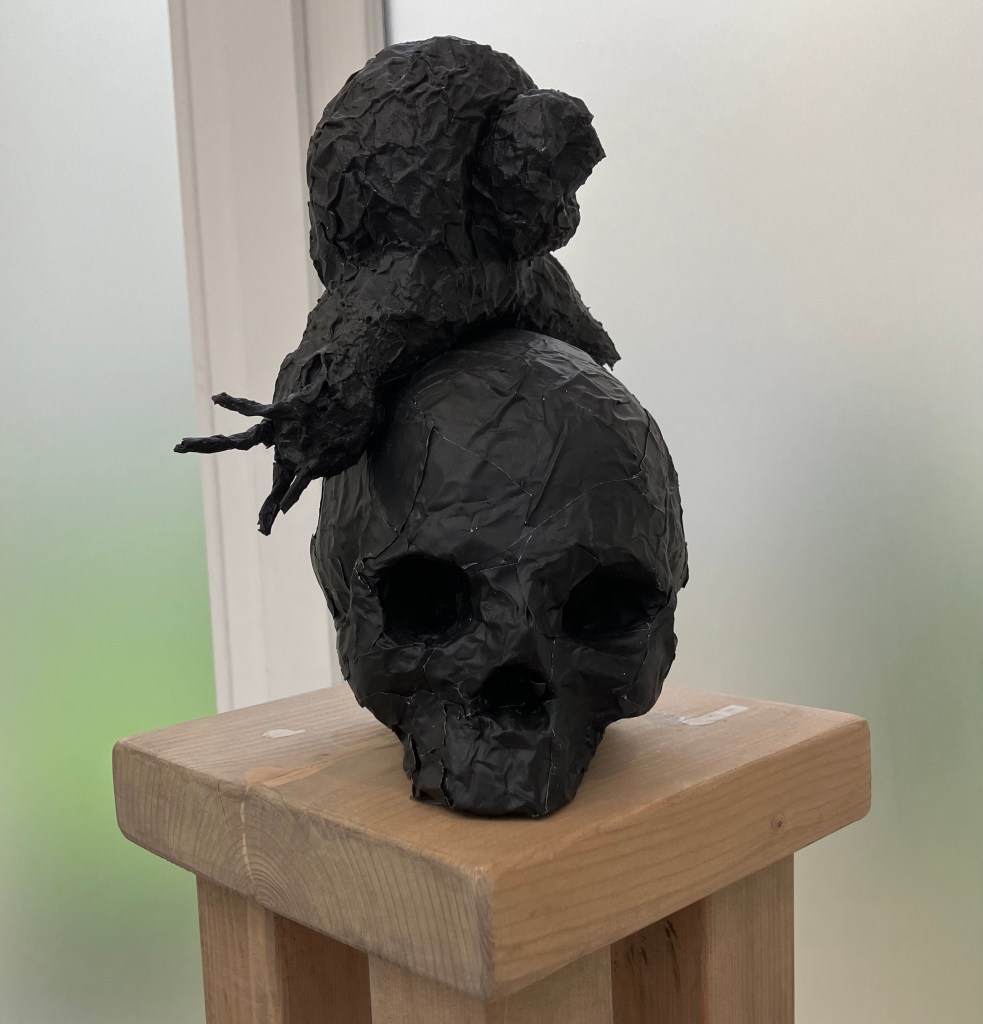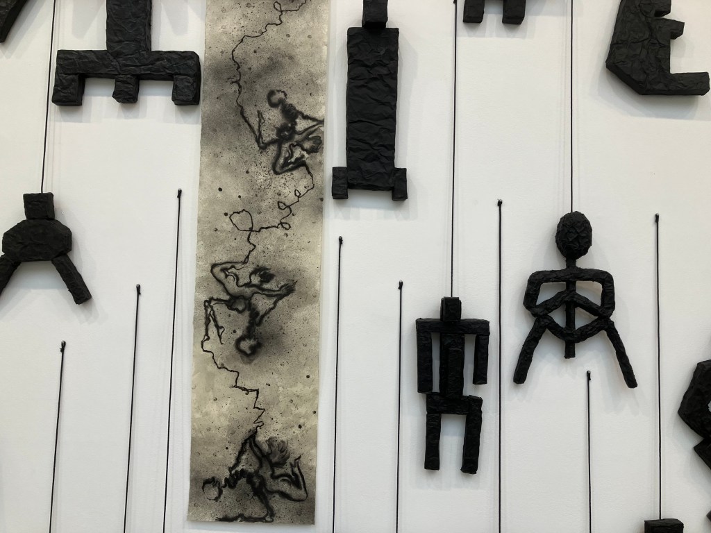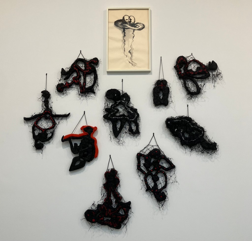 Rez -de-chaussée et sous-sol , dessins et sculptures , en mousse noire et tissu noir enveloppant , formes humaines , escargots , corbeau, vanités avec crânes , et un bel ensemble de 70 figures dessinées.