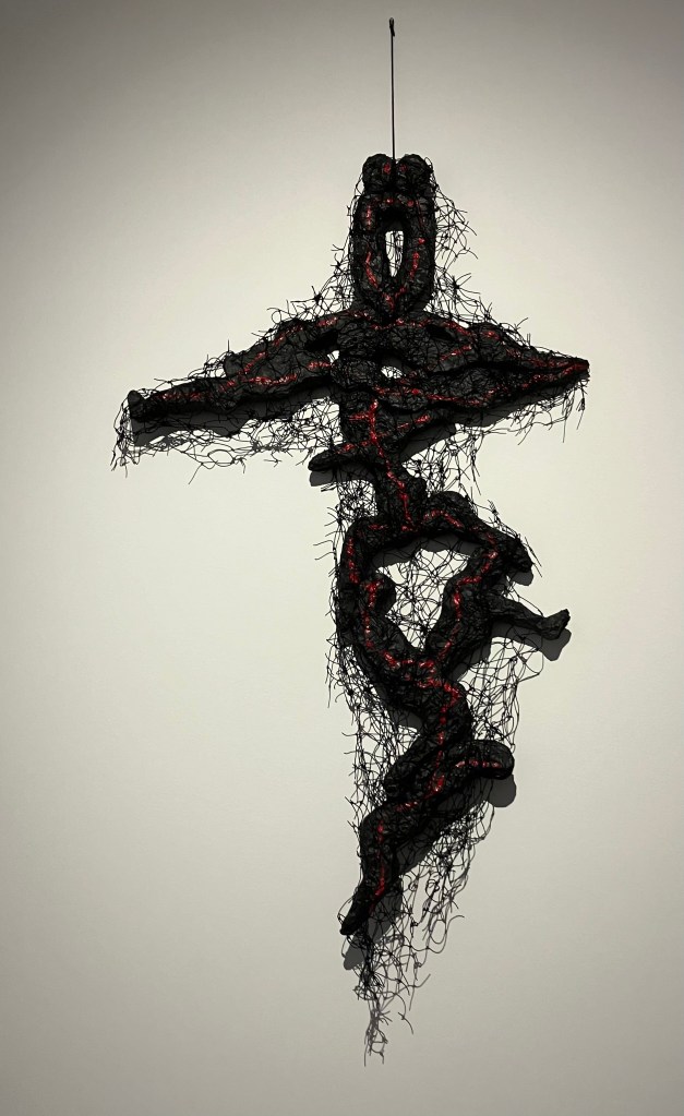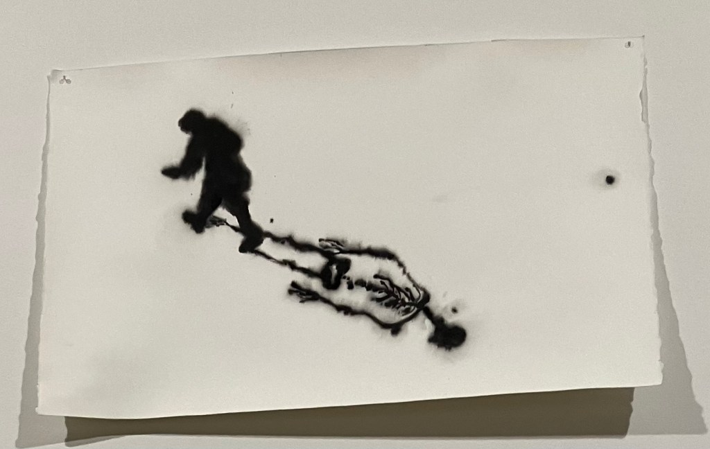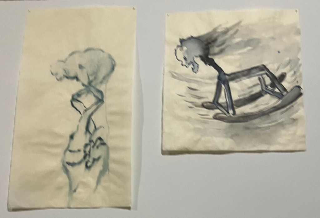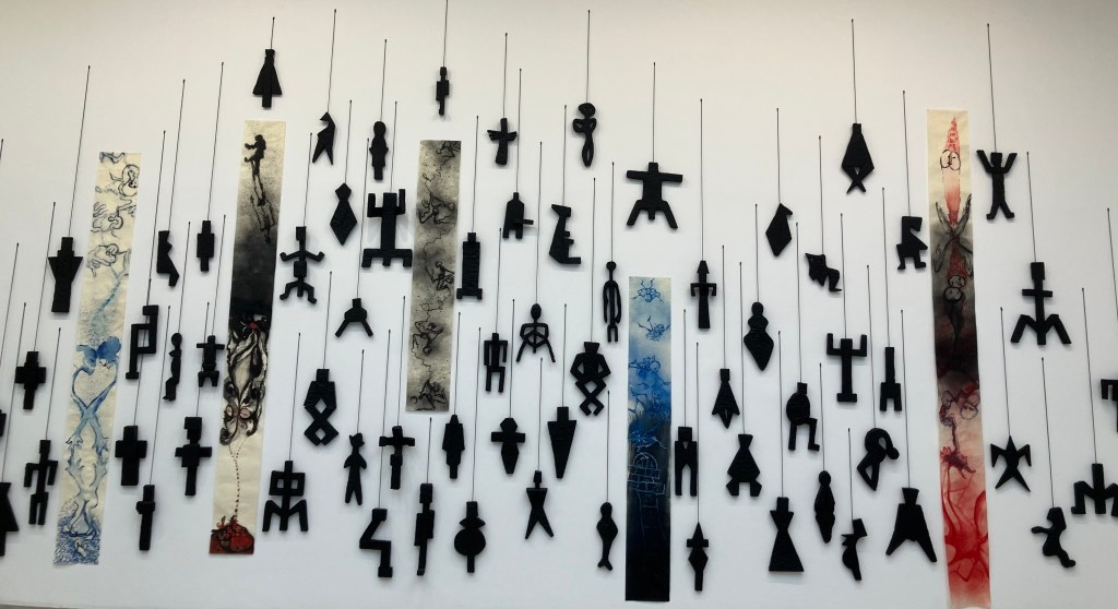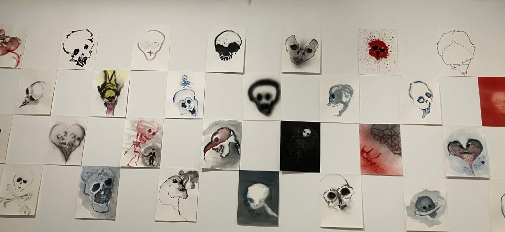 Rez -de-chaussée et sous-sol , dessins et sculptures , en mousse noire et tissu noir enveloppant , formes humaines , escargots , corbeau, vanités avec crânes , et un bel ensemble de 70 figures dessinées.