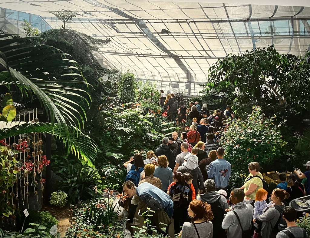 Cette serre lui a pris deux ans , avec tous les détails de la foule de personnages et de la végétation de ce jardin artificiel . Ils font la