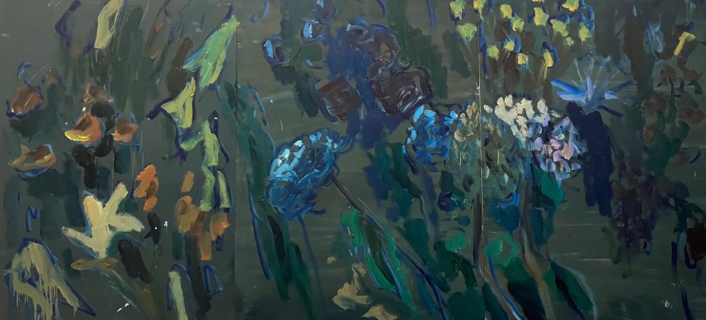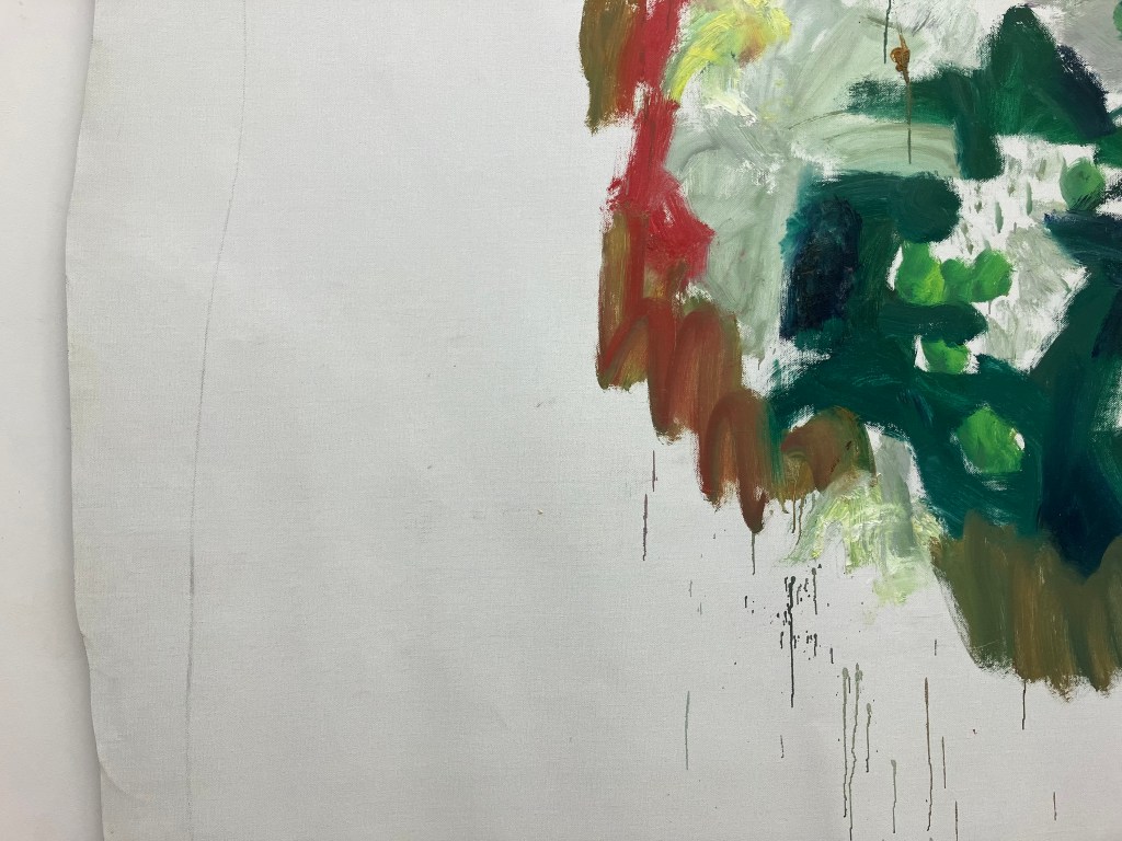 Les toiles beiges ont été peintes en blanc , leur bord n’est pas coupé droit , de vagues traits au crayon les délimitent , ce qui compte c’est les fleurs , réservoirs de formes et de couleurs .