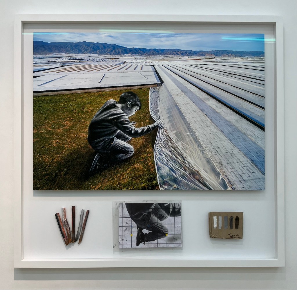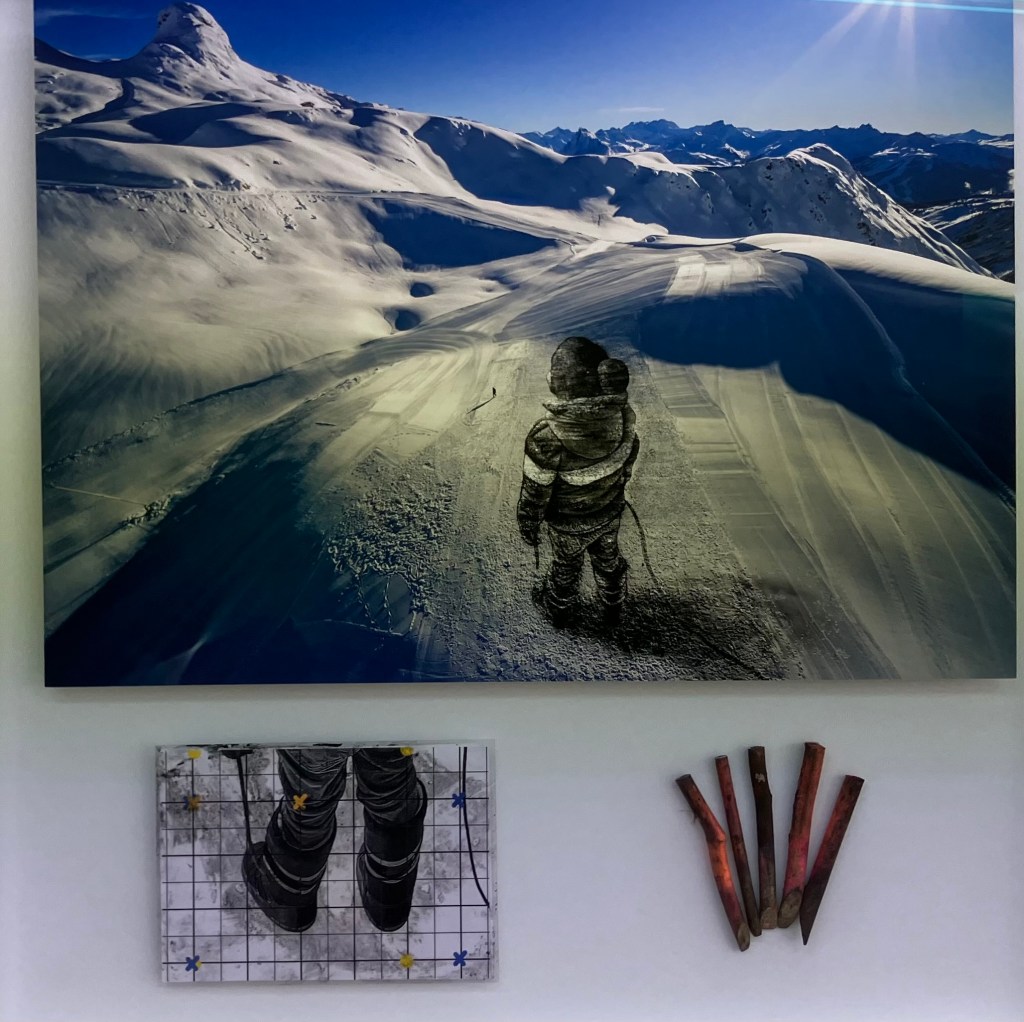 L’artiste du Land Art Swayne ( Guillaume Legros), qui réalise des oeuvres éphémères sous forme de fresques monumentales à même le sol, principalement sur l’herbe , expose ici des traces de ce travail : fragments de peinture biodégradable ,dessins , photos , recherche de couleurs , morceaux de bois .
