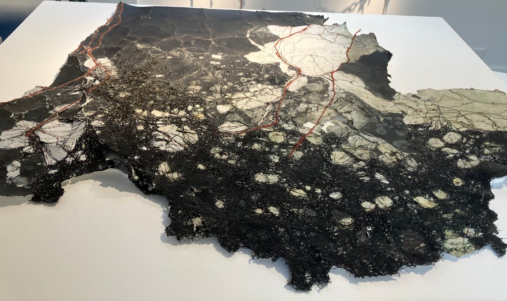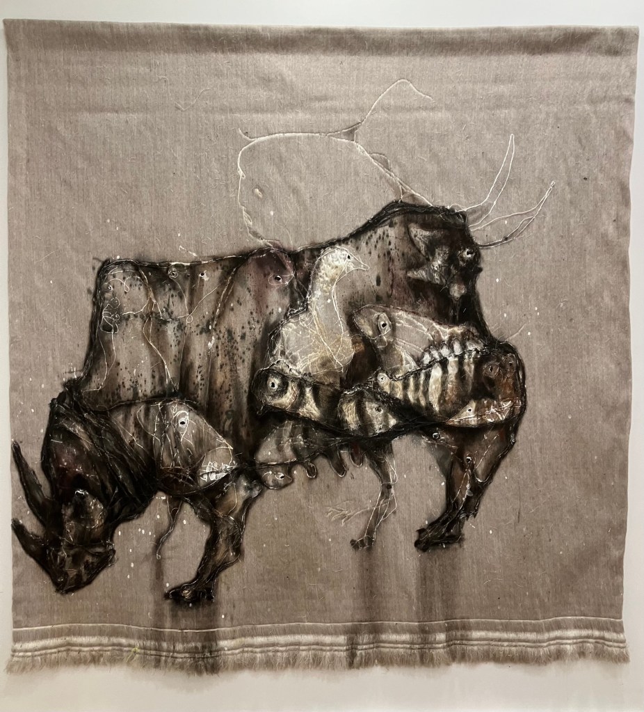 Il a récupéré du pétrole , qui provient d’un naufrage qui a eu lieu en 1973, présent sur l’île d’Ouessant , sous forme de galets, utilisé ici comme un crayon ou dilué avec de la térébenthine, redevenant du pétrole fluide .Il a imprimé des empreintes de filets de pêche qui donnent une apparence reptiliennes aux figures qui se profilent , animées par une poudre dorée soufflée de façon aléatoire . Hasard et contrôle.