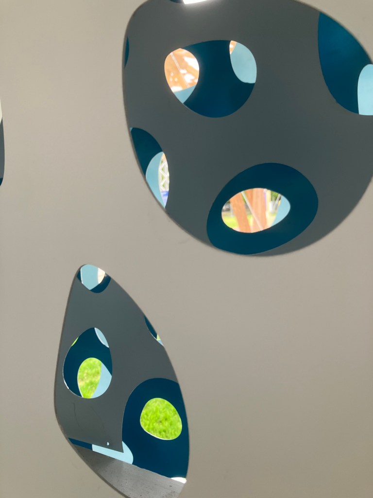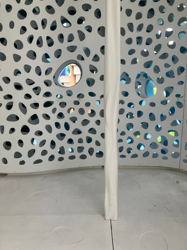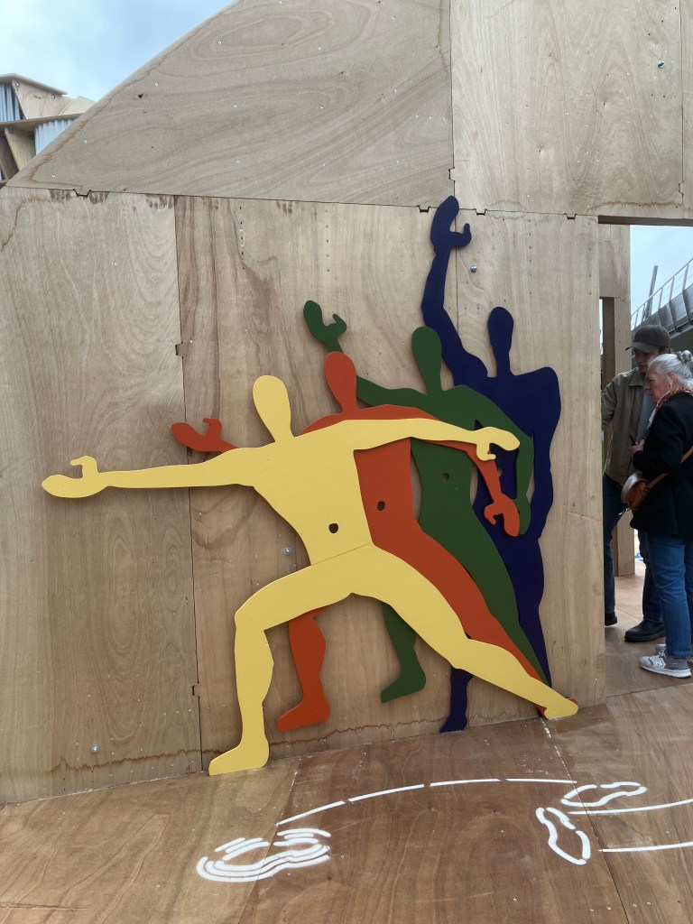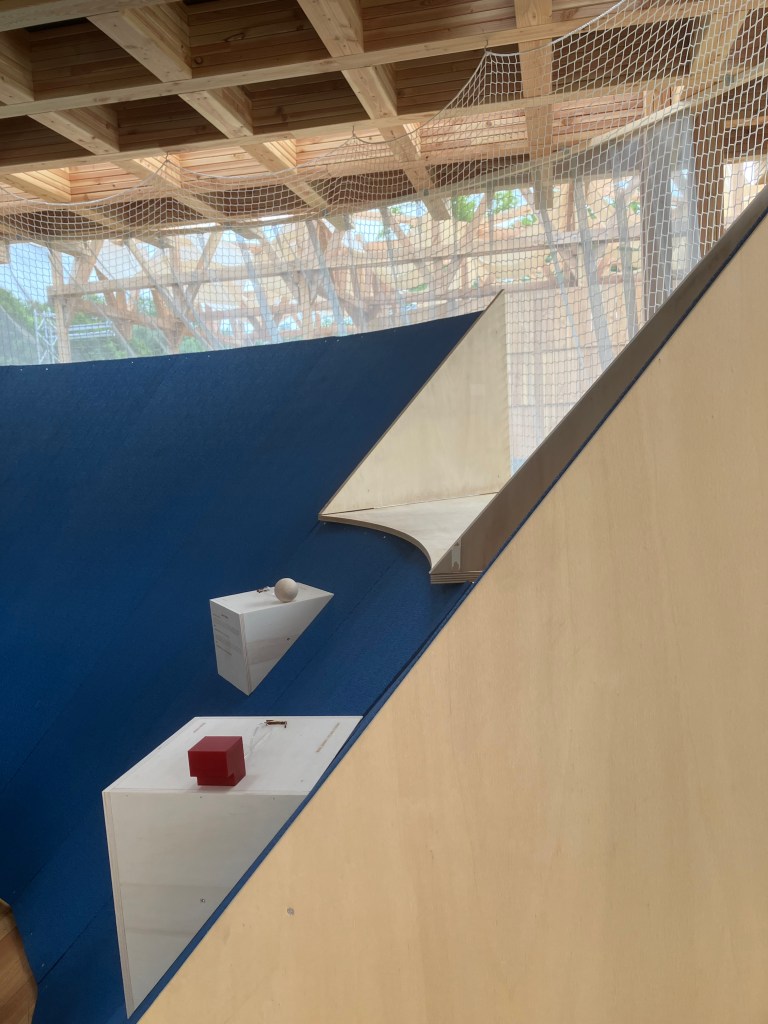 Plein de formes , beaucoup de cercles , mais aussi des jeux de triangles , de cubes , des évocations de bateaux , de l’eau , de raquettes , un mur d’escalade .