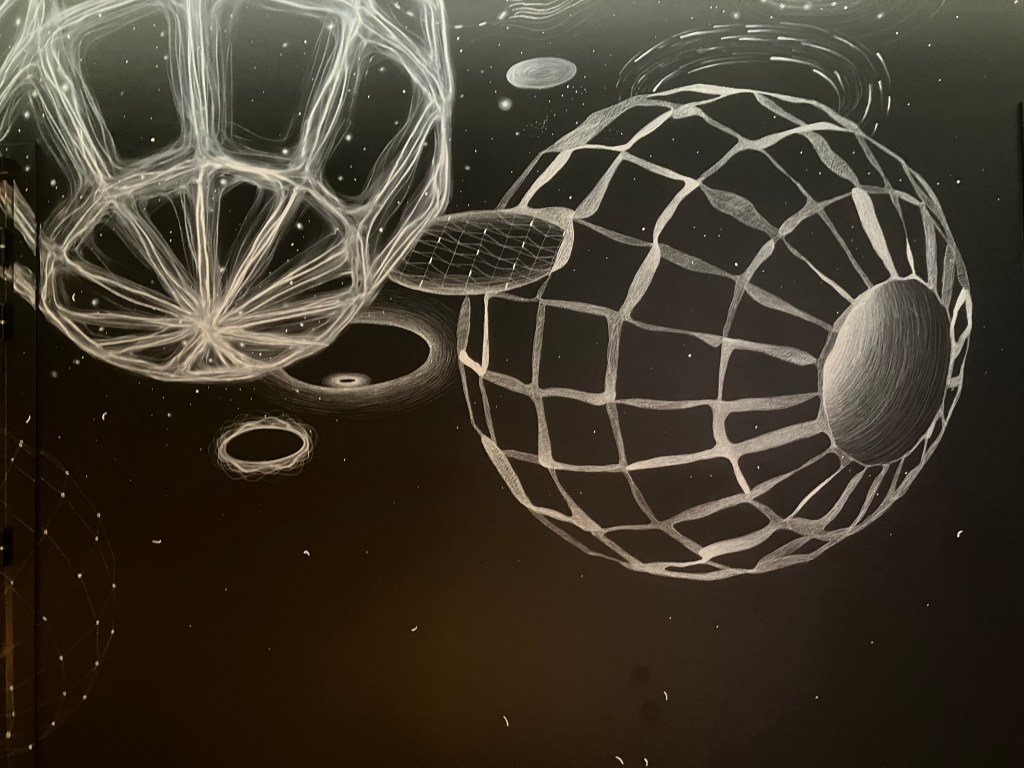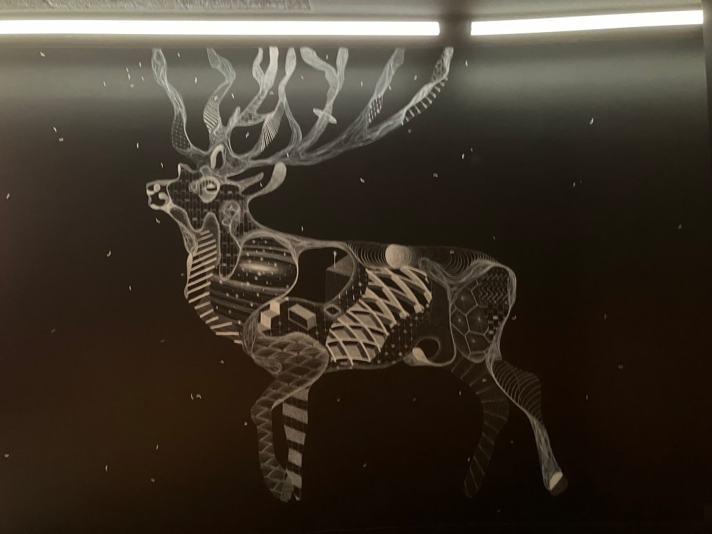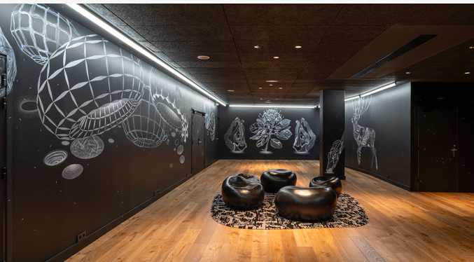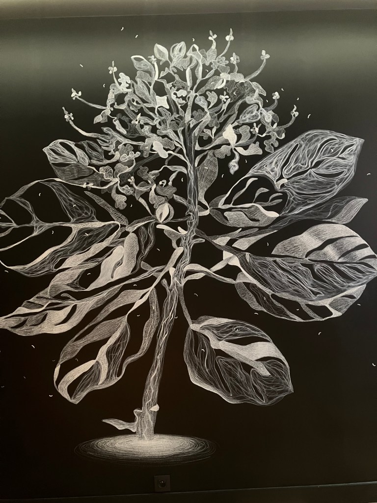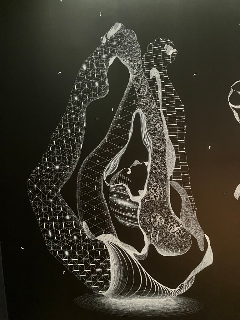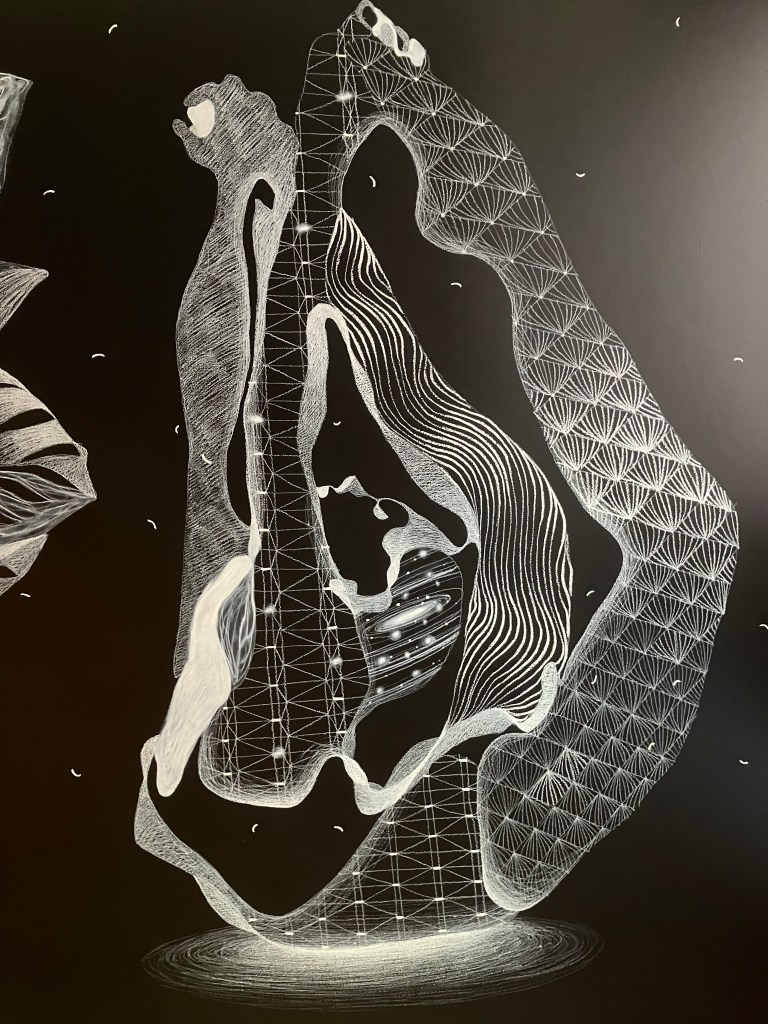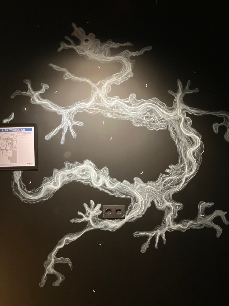 -1 Drawing House , 21 rue Vercingétorix et son hall, en descendant quelques escaliers , consacré aux expos de dessin. Cette fois-ci sur l’ensemble des murs noirs des oeuvres réalisées in situ . Un pas de côté vers le centre , installation inédite et évolutive tout au long de l’année . Thématiques ? Animalière : biche ,cerf , mais aussi le yoga ,l’équilibre, le dragon blanc , la glande pinéale ( entre les deux yeux ), donc l’univers , notre place , notre relation à notre environnement , l’énergie , l’élargissement de la conscience , Prana , rendre visible le sensible .