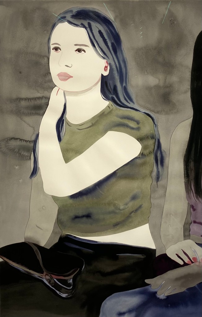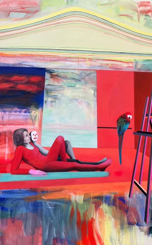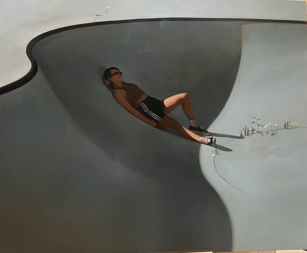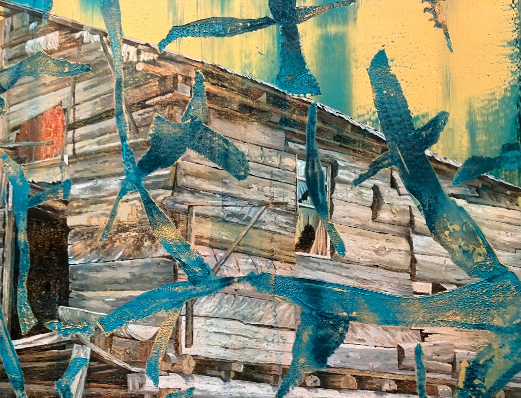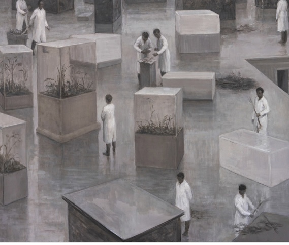 dessins et toiles, beaucoup dans des tons de gris , des personnages en action ,mais énigmatiques .