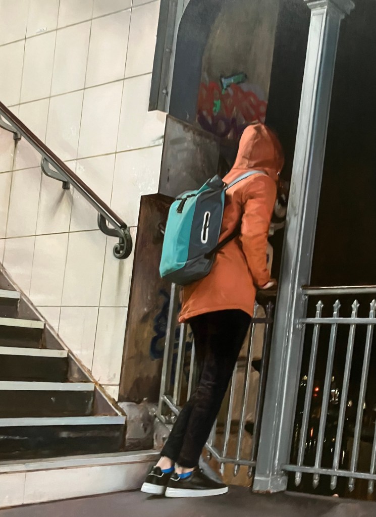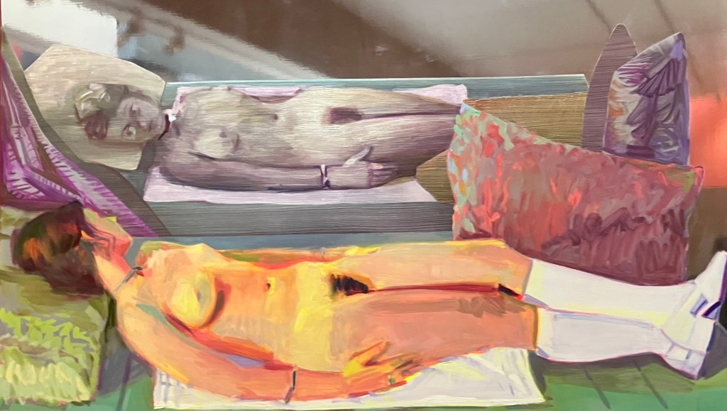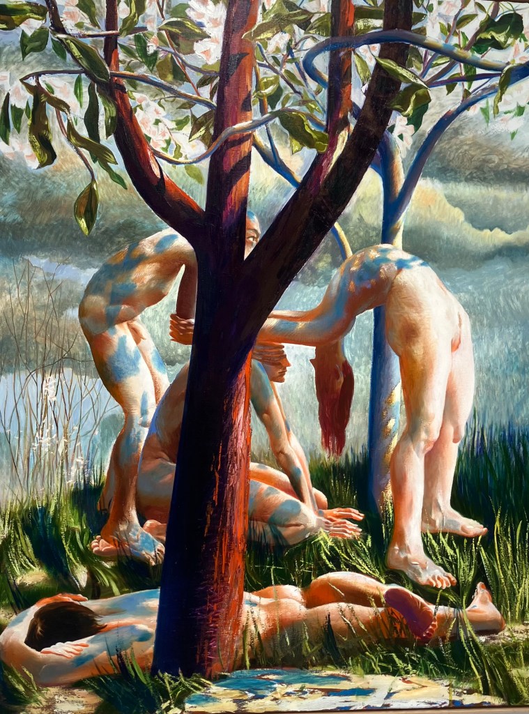 En genéral je ne parle que d’expos gratuites , et là je déroge ! Y aller , c’était pour moi reprendre contact avec ce monde des nombreux peintres contemporains . 80 ont présenté ici chacun une oeuvre placée sur chevalet , dans une petite salle à un endroit bien choisi pour la mettre en relation avec tableaux du passé .Donc …que du figuratif , paysages , portraits , techniques anciennes ou hyperréalisme , mamma mia , au secours ! Comme dit Télérama, une sorte de speed dating ! De 14 h à21h30 , les peintres étant en grande partie présents pour répondre aux questions répétitives des touristes .Quelques noms connus , Petrovitch, Childress,Mayaux,Herbelin , Cognée , parmi tant de monde .On sait que dans une foule on trouvera toujours quelqu’un avec qui échanger idem pour les tableaux , au milieu de ce que certains vont considérer comme des crôutes , ou des ambitions ringardes , des oeuvres qui vous font signe , ouf !