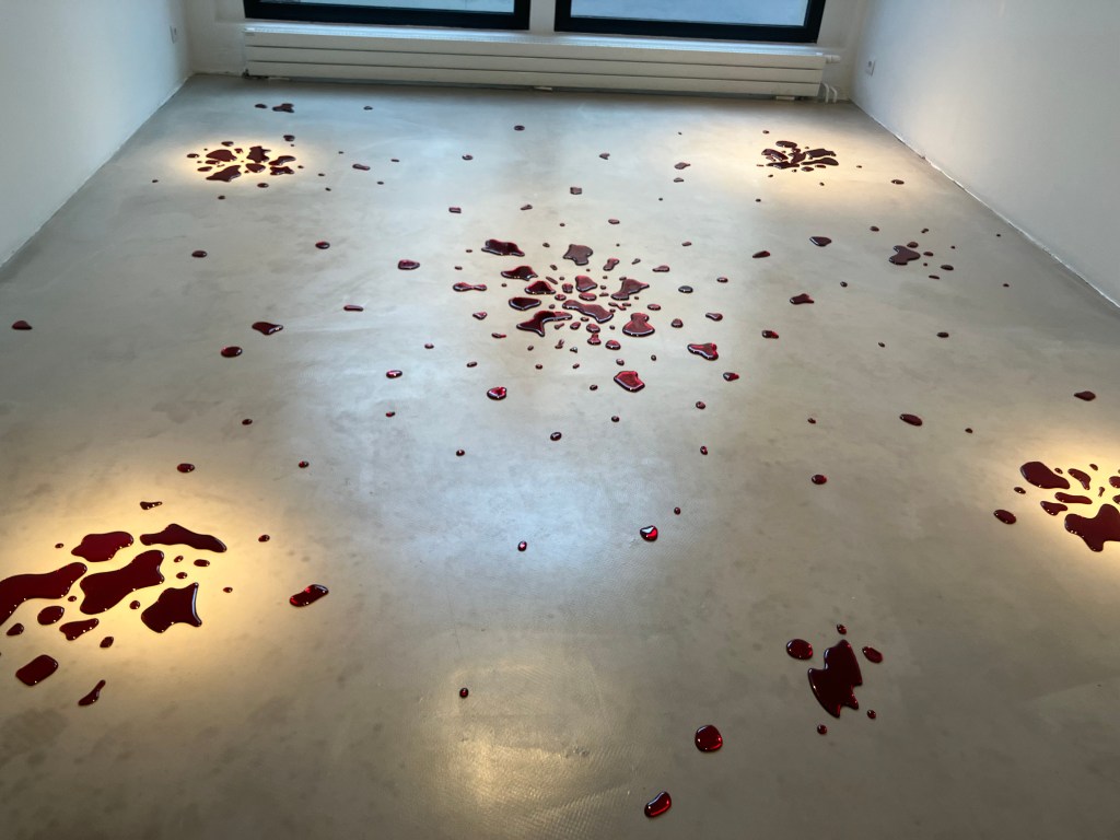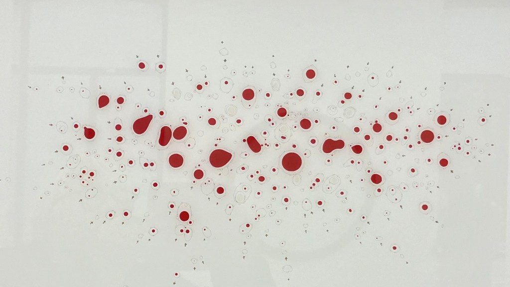 8- La rue du renard est toute proche , la galerie Ceysson Bénétier , au 23 , a choisi asterochromies , de Philippe Favier , jusqu’au 5 octobre , et son retour au dripping , au verre , au rouge sang .