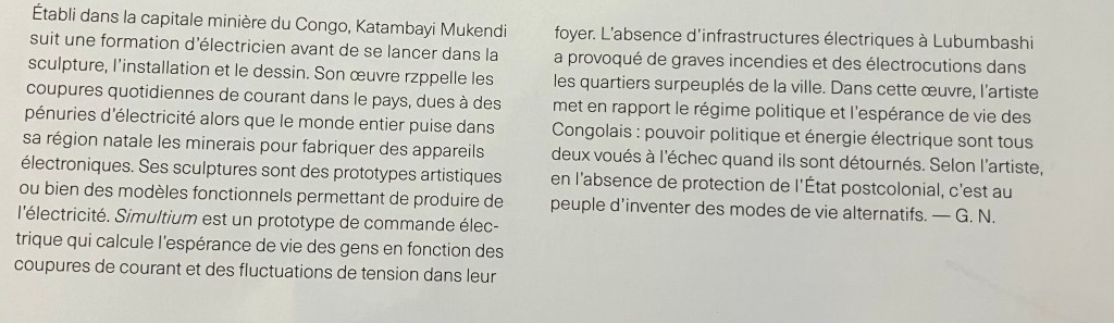 9-0n découvre la galerie Micki Leng , au 2 rue Beaubourg , qui fête son inauguration avec 4 sculptures iconiques et des oeuvres sur papier deJean Katambayi Mukendi, délestage , jusqu’au 11 octobre .