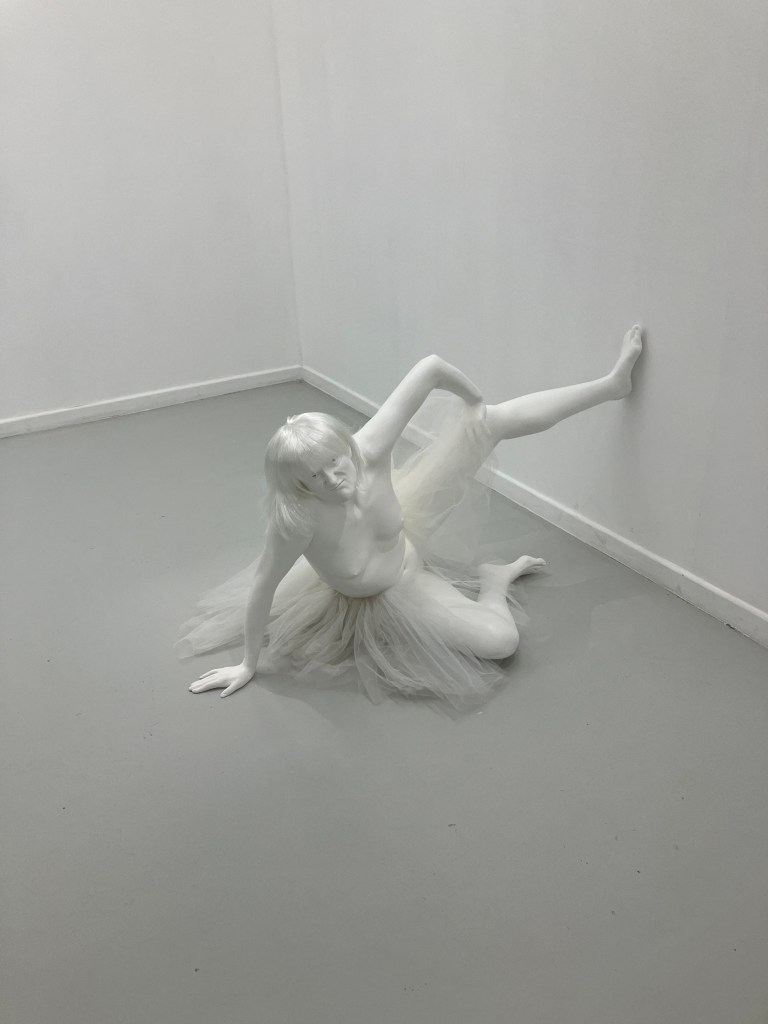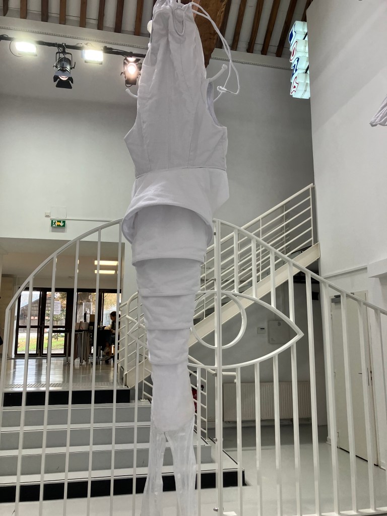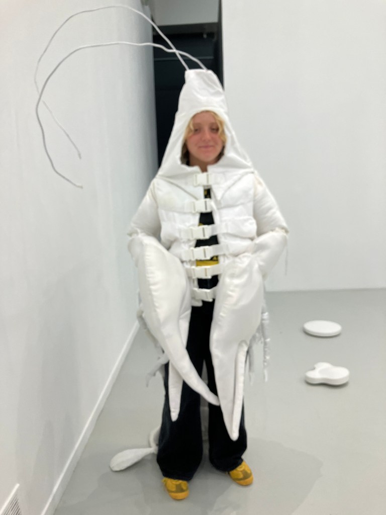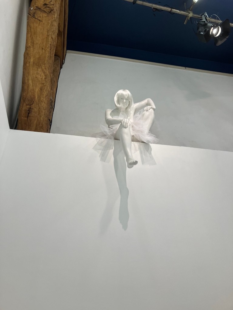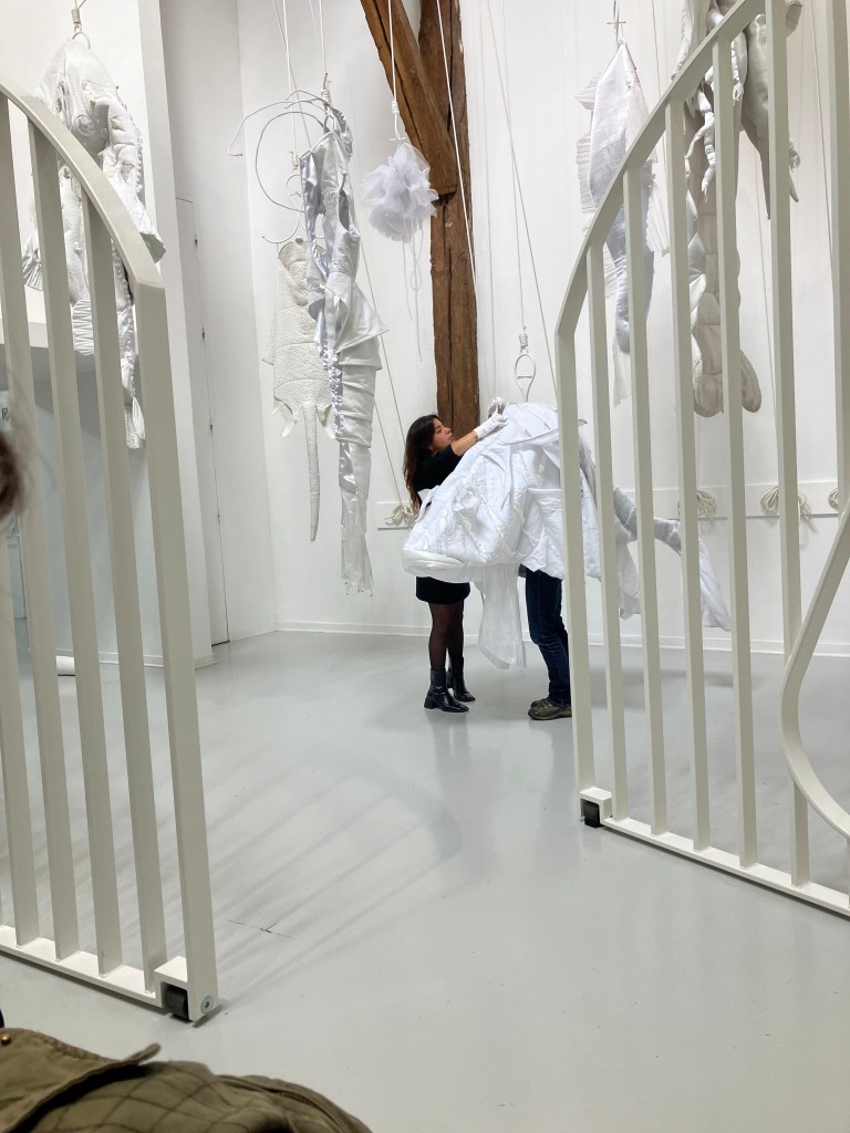 Elle joue sur l’idee du prix à payer , argent et sacrifices pour entrer dans un parc d’attraction , c’est sobre , tout est blanc. Elle a créé des vêtements en forme de poissons que des habilleuses en gants blancs nous aident à enfiler si nous le désirons , elle se représente en gargouille ou danseuse de Degas très critique , tout est espacé mais très habité , des médiateurs sont là . C’est beau , ludique et intelligent , et ce lieu on l’adore !