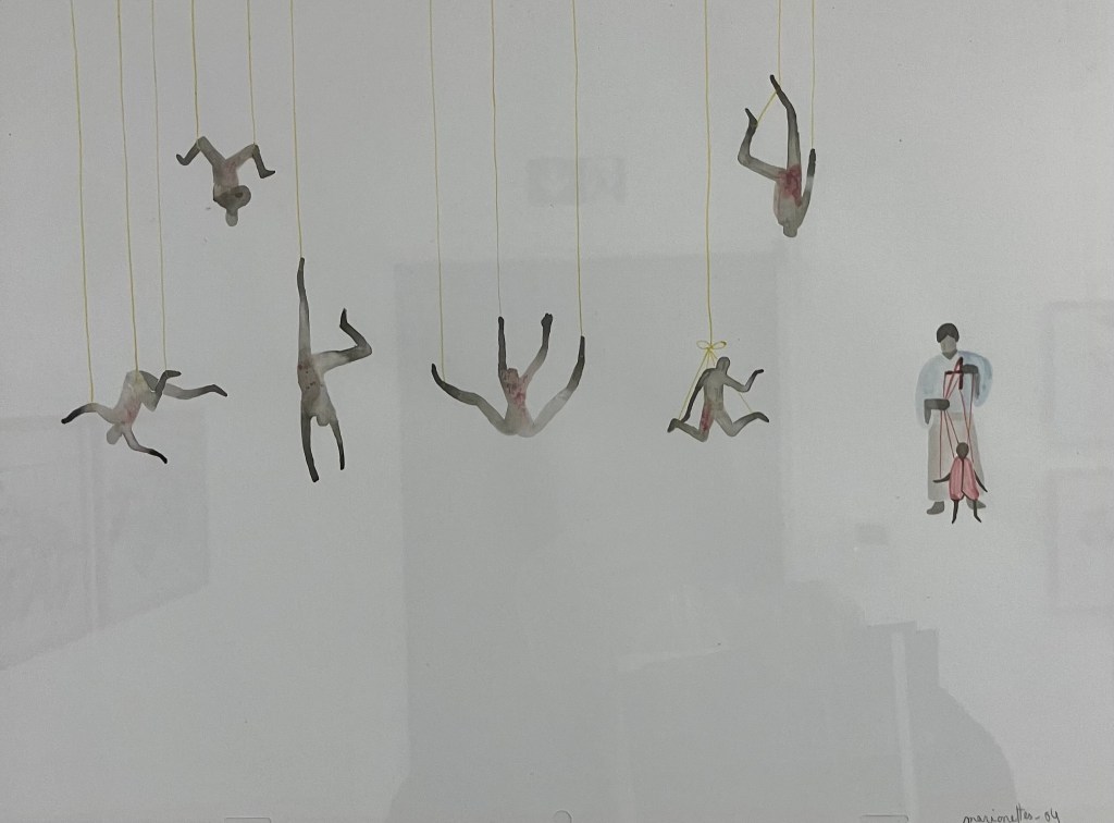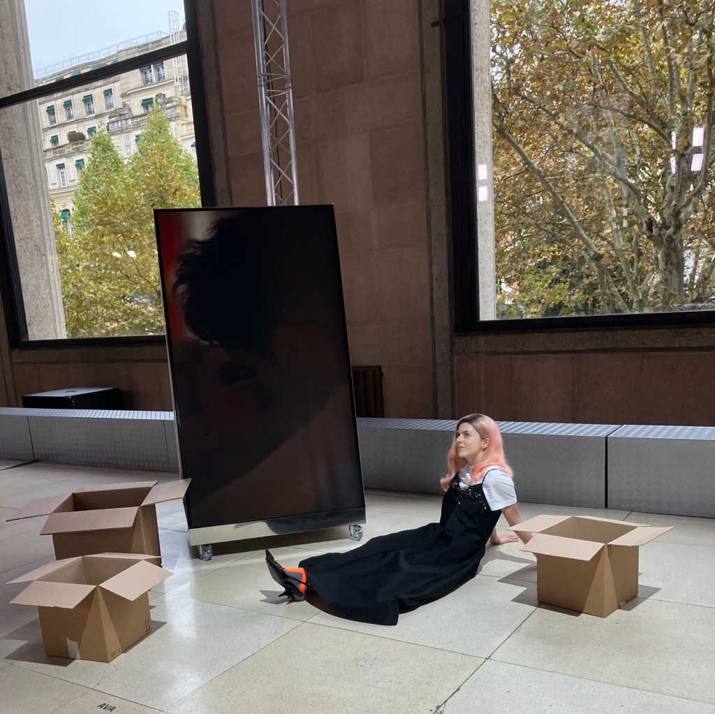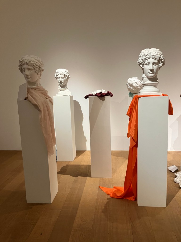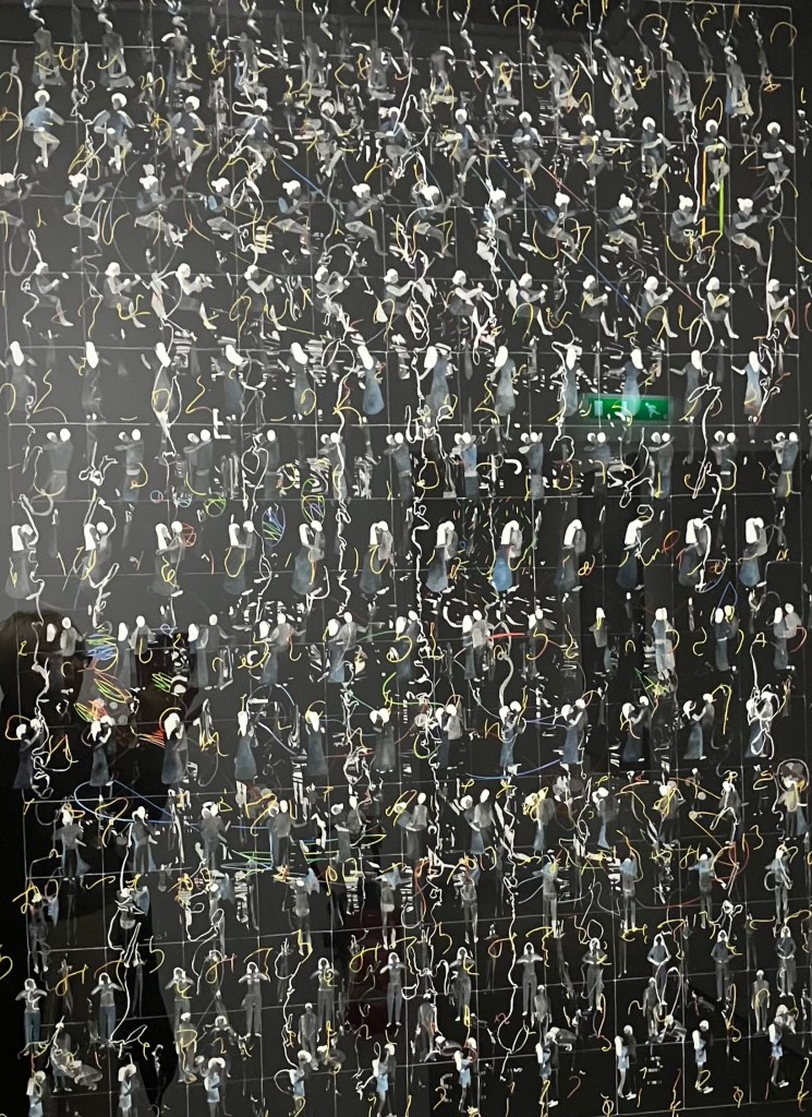 Elle joue sur l’idee du prix à payer , argent et sacrifices pour entrer dans un parc d’attraction , c’est sobre , tout est blanc. Elle a créé des vêtements en forme de poissons que des habilleuses en gants blancs nous aident à enfiler si nous le désirons , elle se représente en gargouille ou danseuse de Degas très critique , tout est espacé mais très habité , des médiateurs sont là . C’est beau , ludique et intelligent , et ce lieu on l’adore !