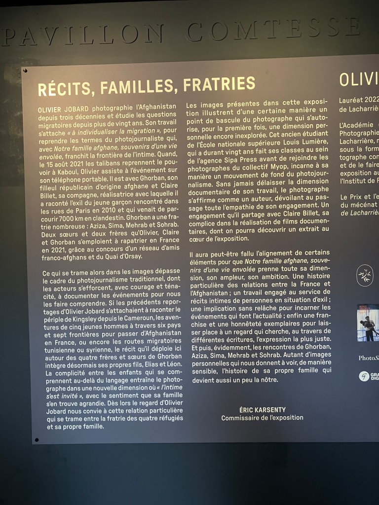 3 – jusqu’au 24 novembre , au pavillon Comtesse de Caen (Institut) ,on va découvrir le reportage photographique de plusieurs années d’Olivier Jobard , notre famille afghane , souvenirs d’une vie envolée.Il suit pendant 7 ans un enfant afghan seul à Paris, qu’il parraine , il l’accompagne , après son bac , pour un retour en Afghanistan , voir la famille ,puis vu les ciconstances organise l’évacuation des 4 autres membres de la fratrie, et documente leur parcours en France, et il retourne là- bas revoir les 2 parents .Beau témognage d’humanité et de solidarité .