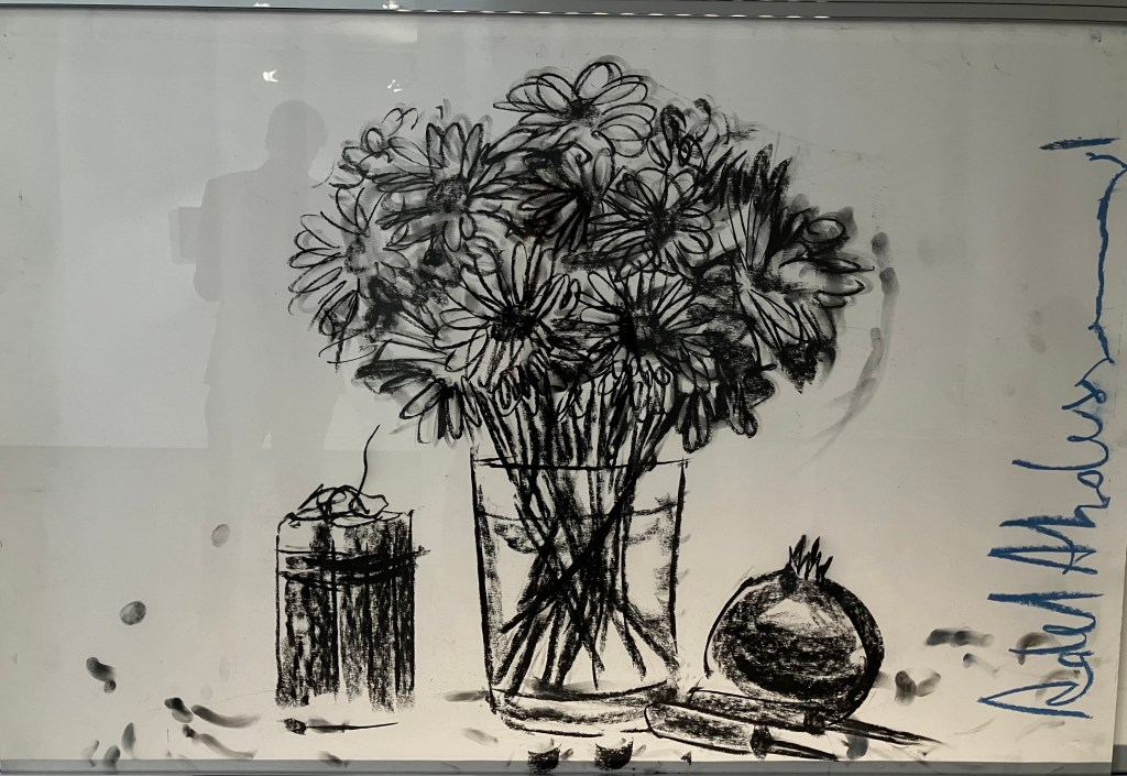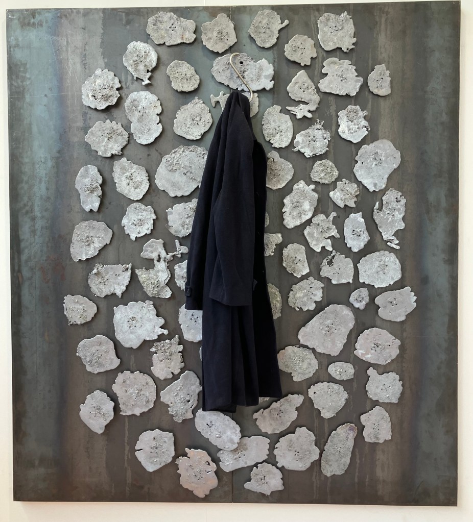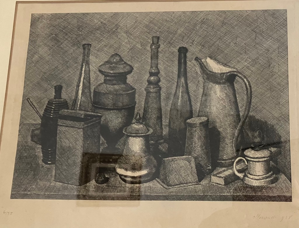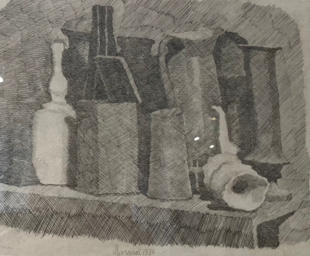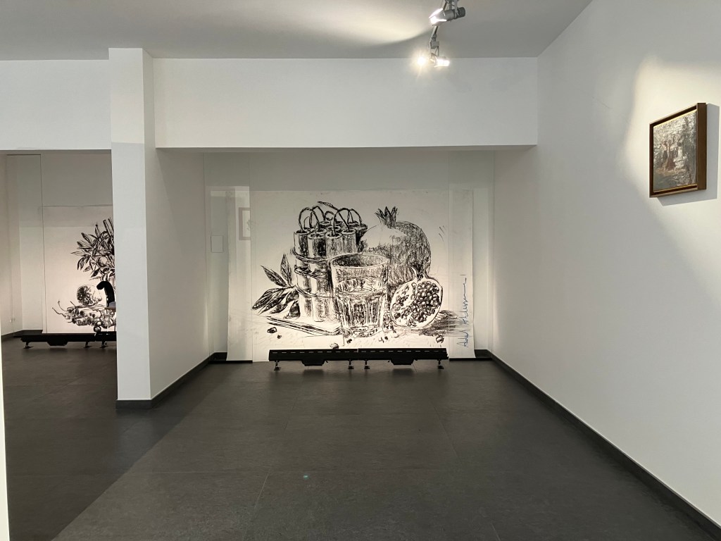Petit espace de deux pièces ouvertes , super expo d’inauguration , un face à face Adel Abdessemed et Giorgio Morandi , Guerre et paix , dessins au fusain épais et grand format contre gravures , sujet : natures mortes .