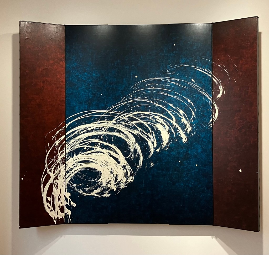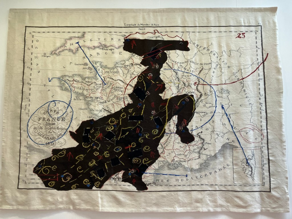 13 au Drawing lab , 17 rue Richelieu , où Boris Labbé montre une œuvre immersive , ito meikū, le fil d’errance . Il y a deux casques de réalité virtuelle , c’est les vacances , des touristes sont là , avec des enfants , je n’ai donc vu que les oeuvres énigmatiques exposées aux murs .