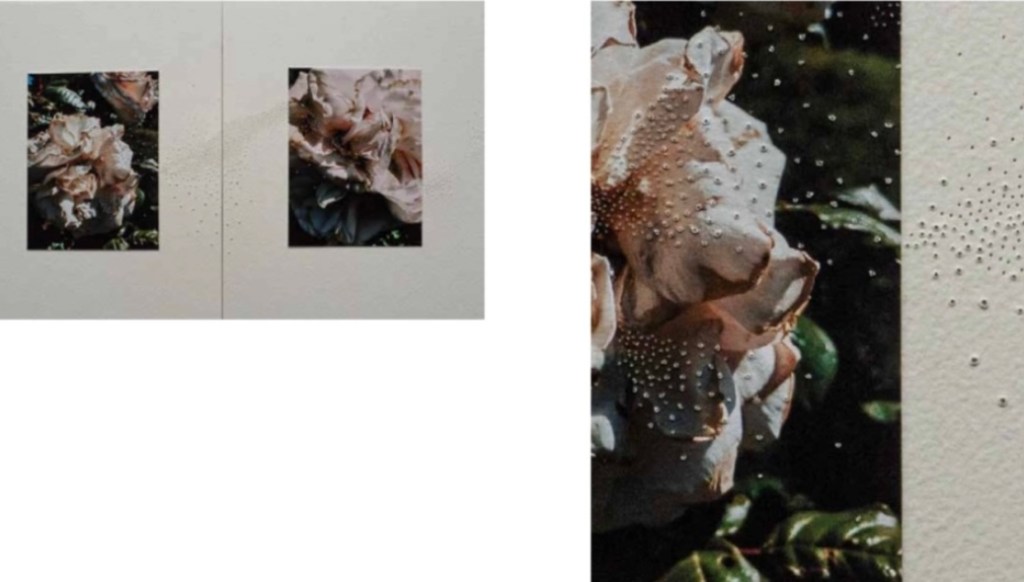 promenade à Montreuil , dans les murs à pêches , parait- il , l’une photographie en noir et blanc , grande banalité , mais la grâce vient des interventions de l’autre , perforations , grattages , colorisations partielles ou intégrales , c’est merveilleux . On peut voir ces œuvres jusqu’au 25 janvier .