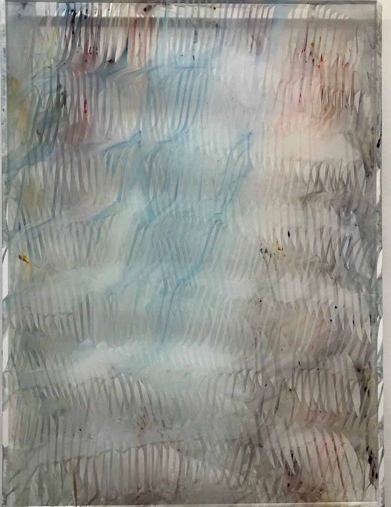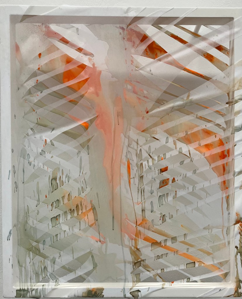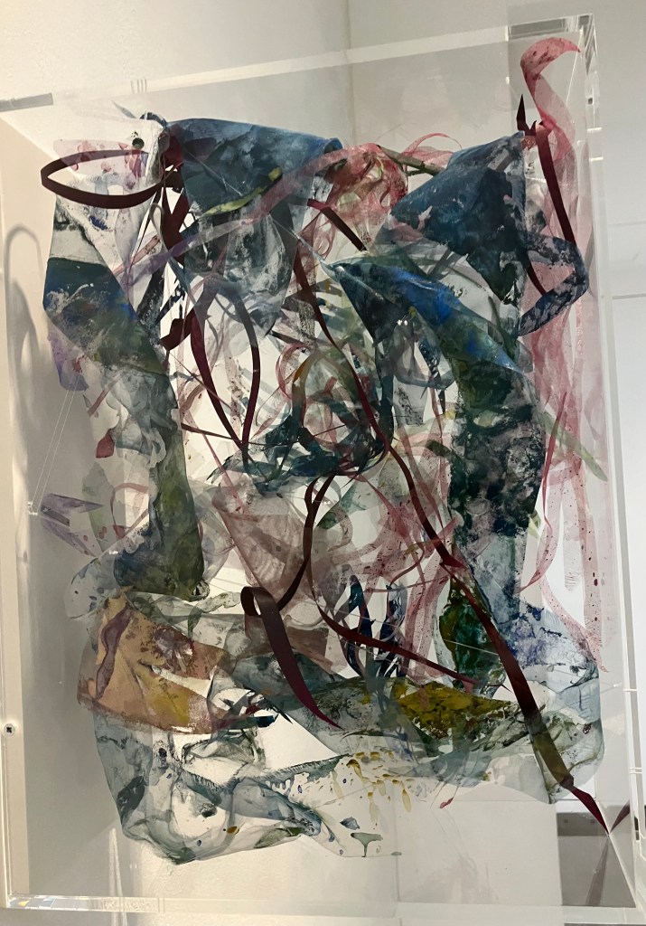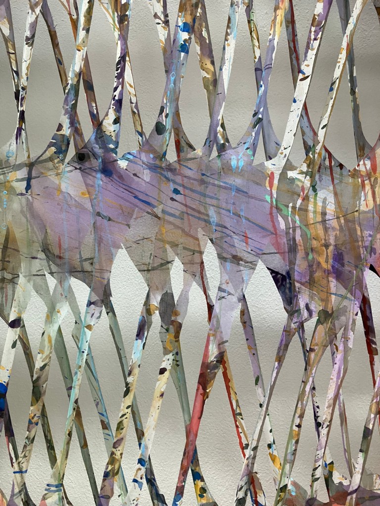 Organza découpé de chaque côté du cadre , superpositions , parties ajourées , peinture , vibration . C’est saisissant .
