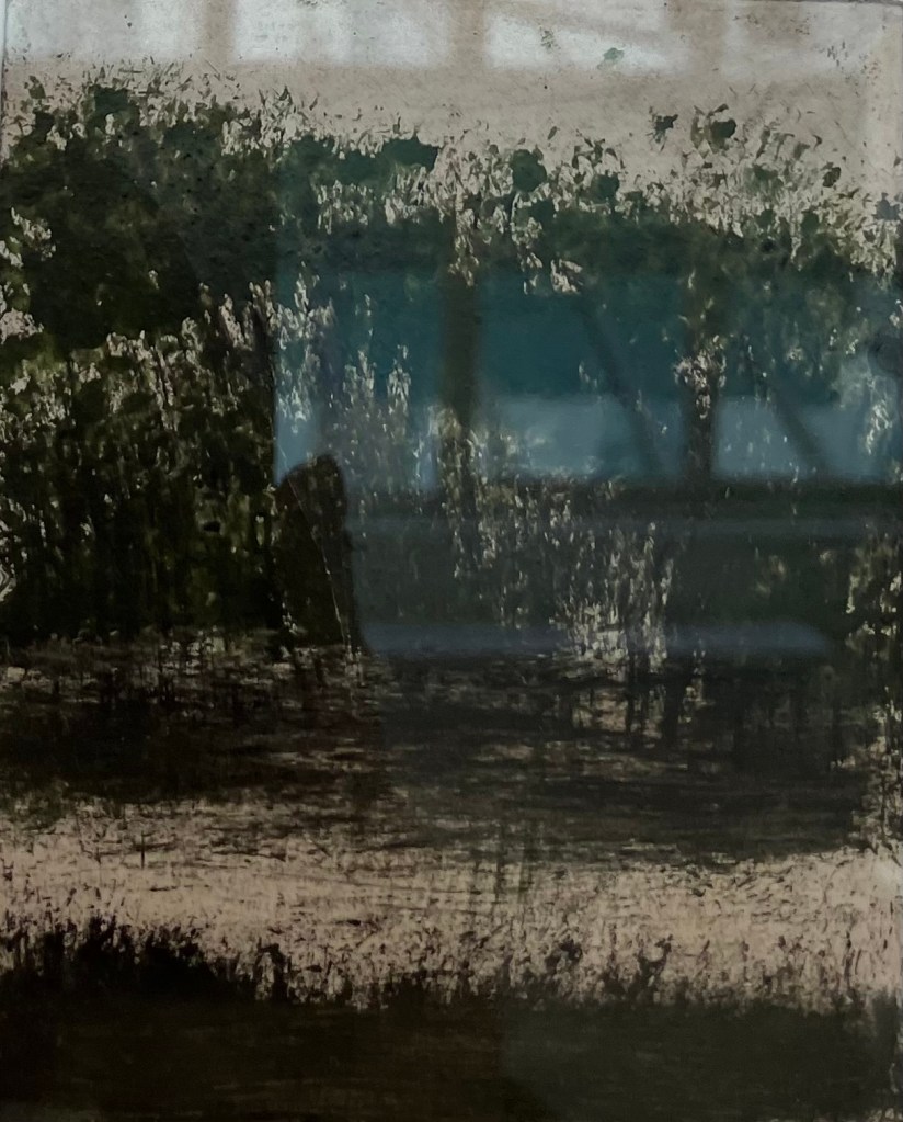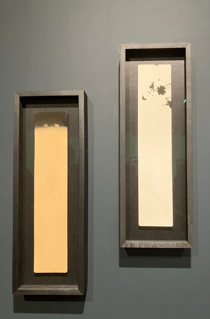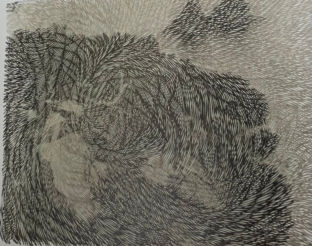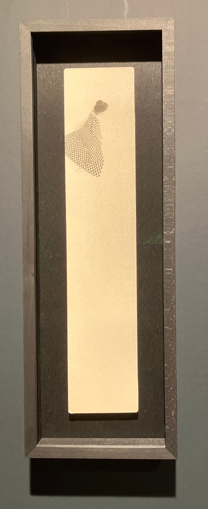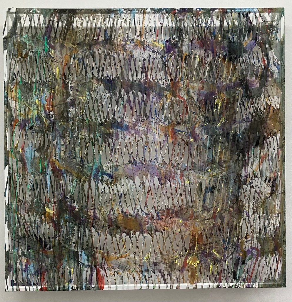 Organza découpé de chaque côté du cadre , superpositions , parties ajourées , peinture , vibration . C’est saisissant .