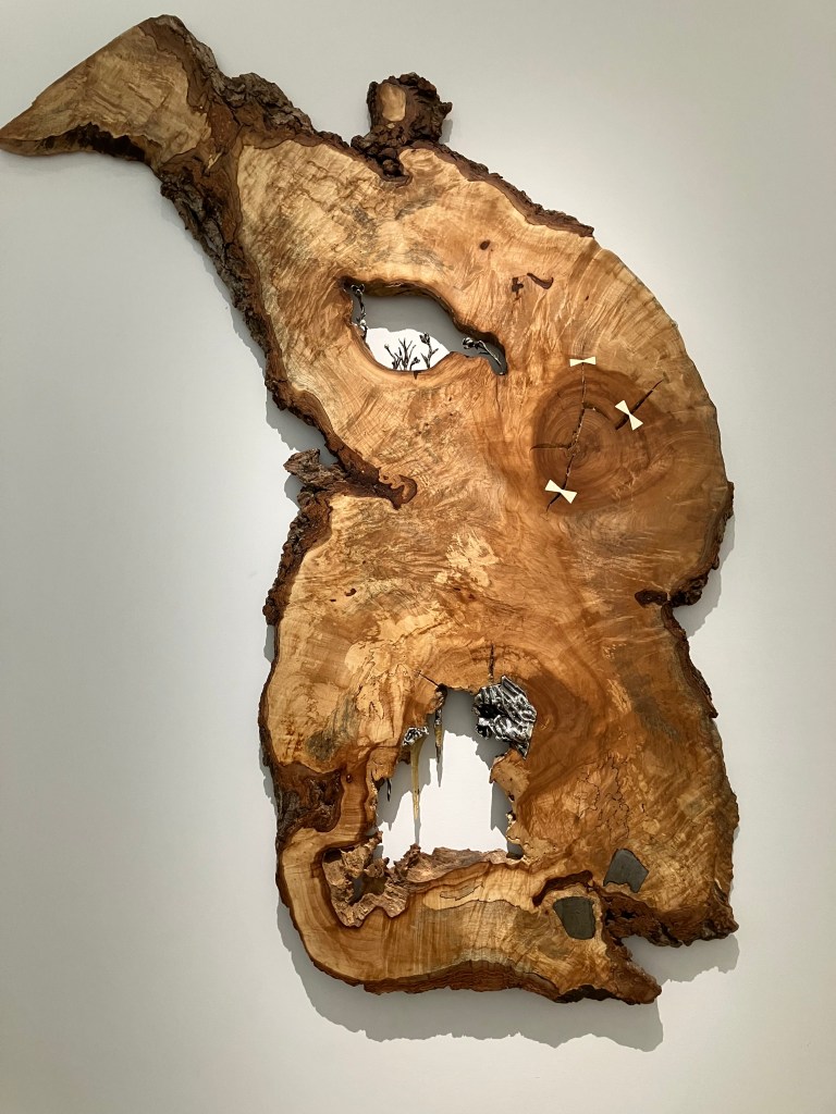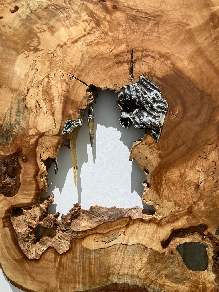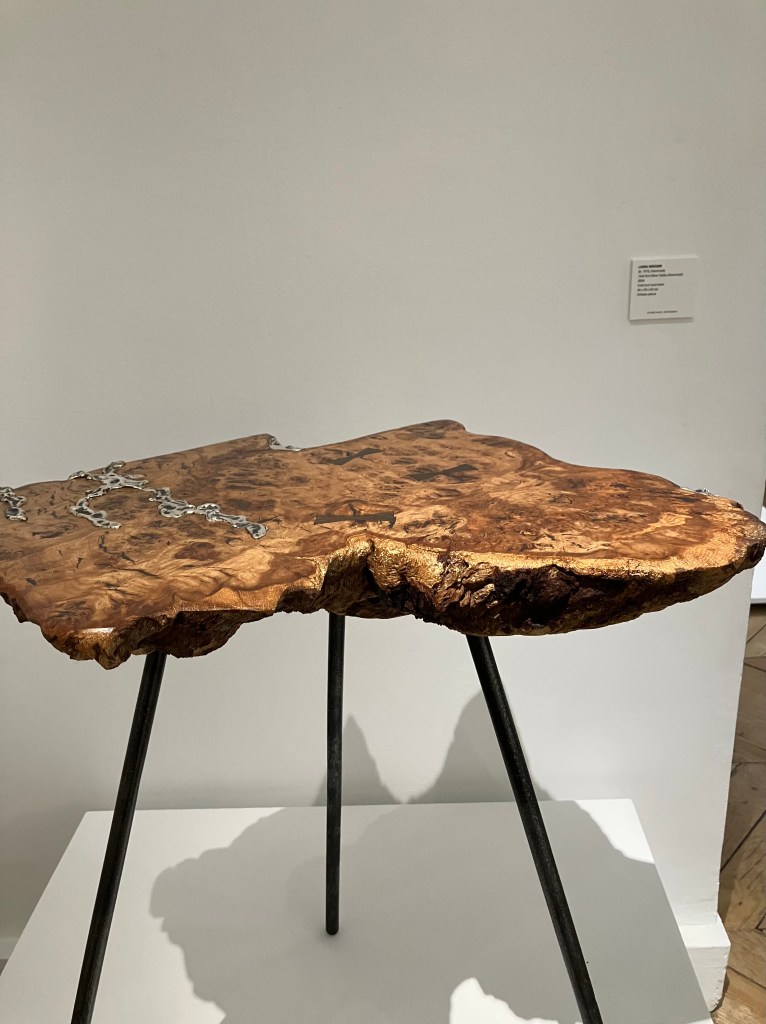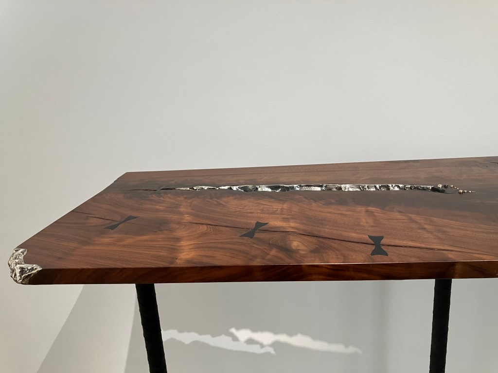 Que voit- on ? Du bois très ancien , ou rare , transformé en mobilier ou en tableau , des parties , des failles sont renforcées par de l’argent, certaines fissures sont juste indiquées par des sortes de papillons sombres .Cette danoise a un profond amour pour les arbres ,et veut révéler leur âme dans ces pièces uniques ,ponctuées parfois de diamants .Elle combine naturel et préciosité , pour susciter admiration et sens de la responsabilité par rapport à la nature .Chaque pièce contient une sorte de longue vis en argent , cachée sur le côté et qui en est la signature .