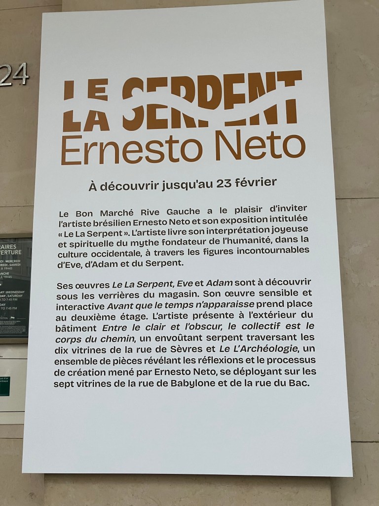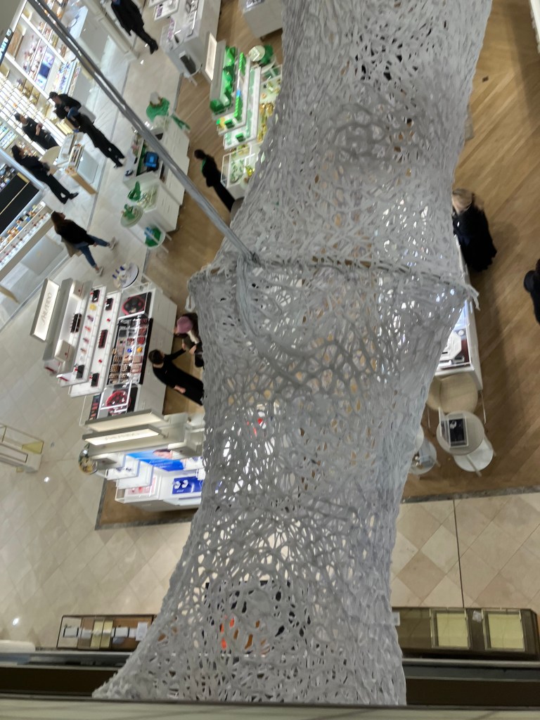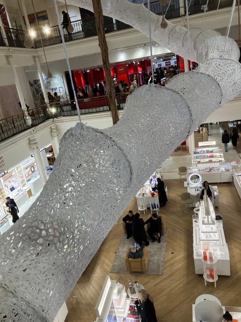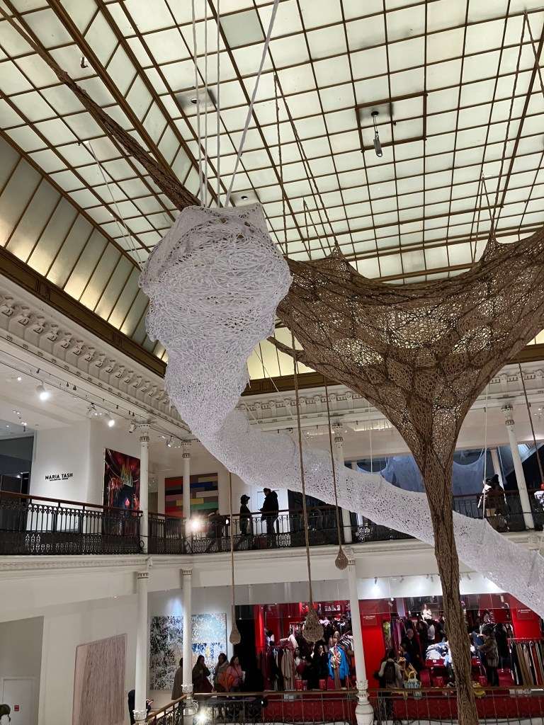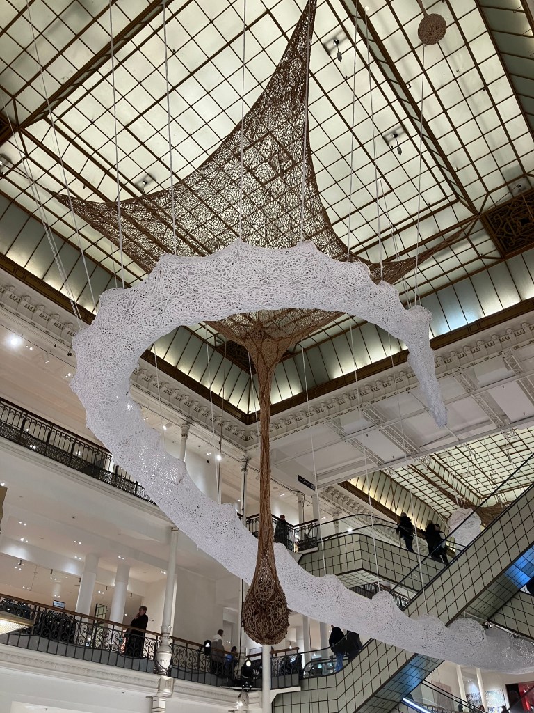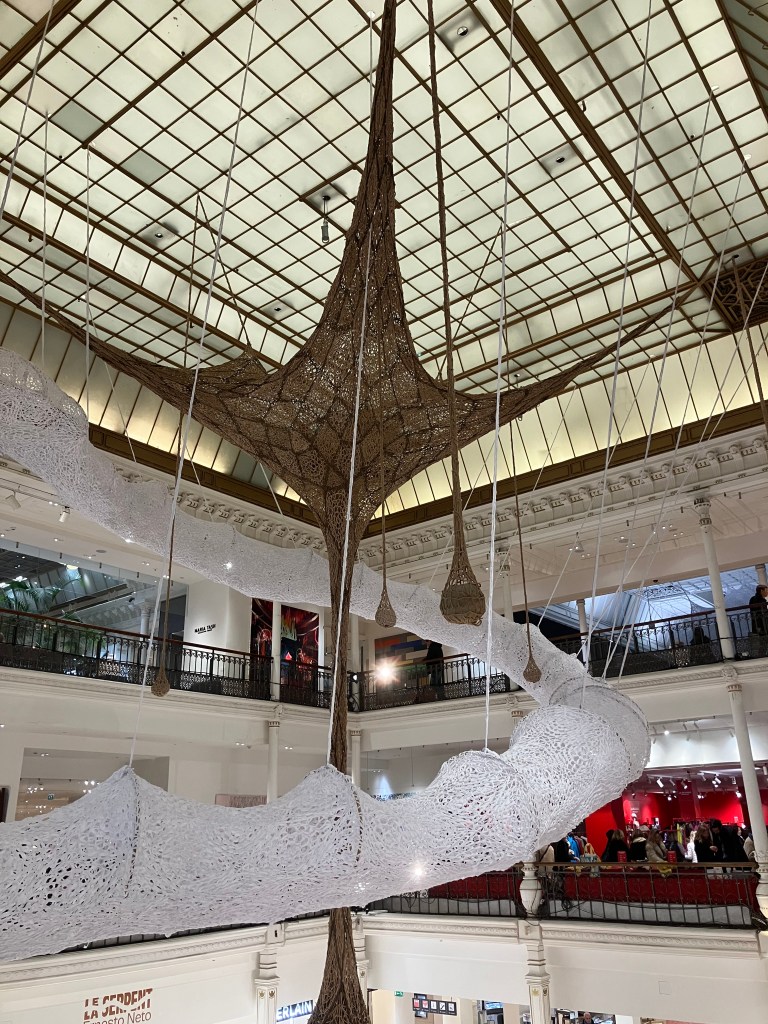 Comme chaque année on file au Bon Marché qui a l’habitude d’organiser en cette période une installation en hauteur , des deux côtés de l’escalator d’Andrée Putman , ses vitrines et un lieu dédié au 2 eme étage, qui sont une commande à un artiste contemporain , je me souviens de Prune Nourry, de Chiharu Shiota , de Buren . Cette année c’est un artiste brésilien qui est mis à l’honneur .