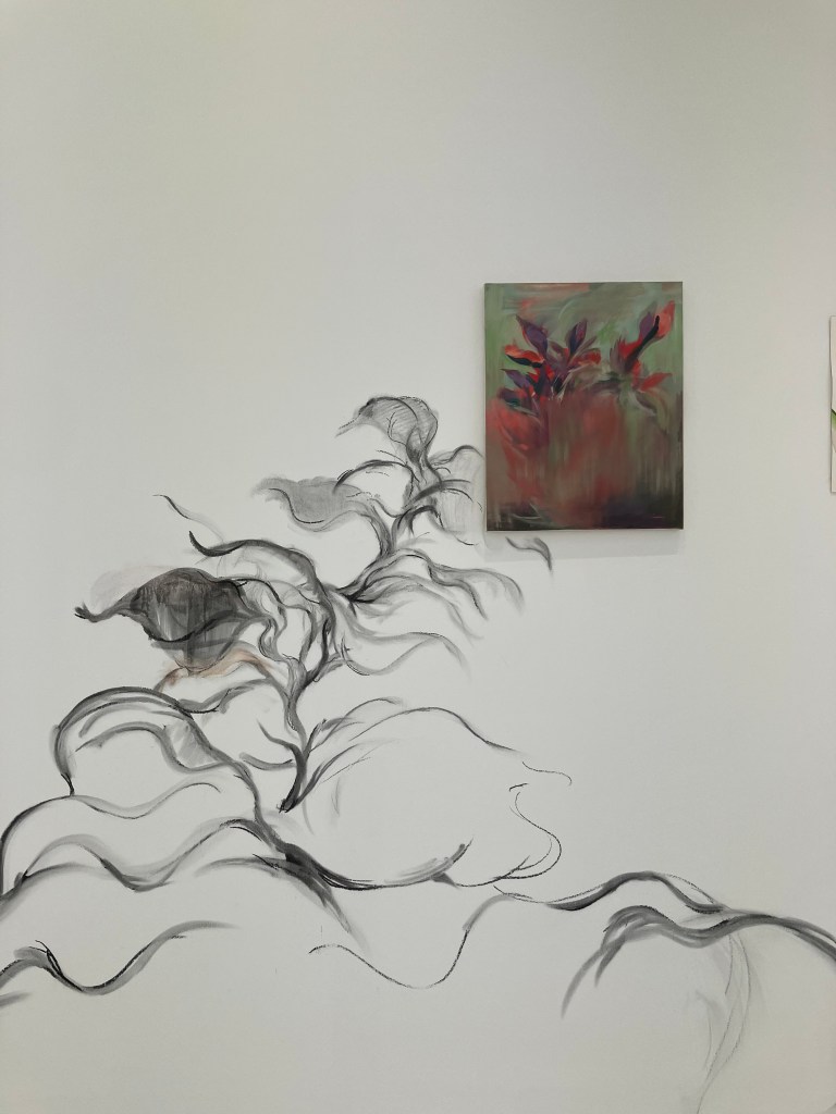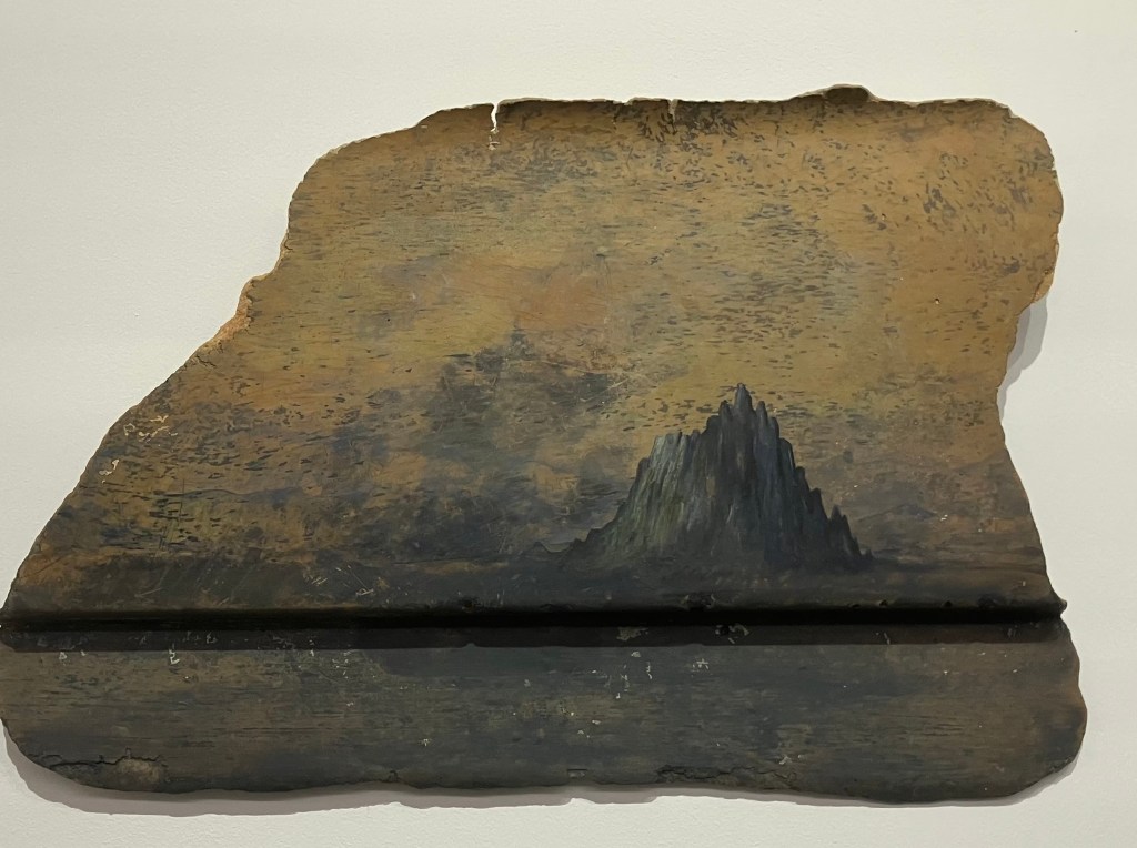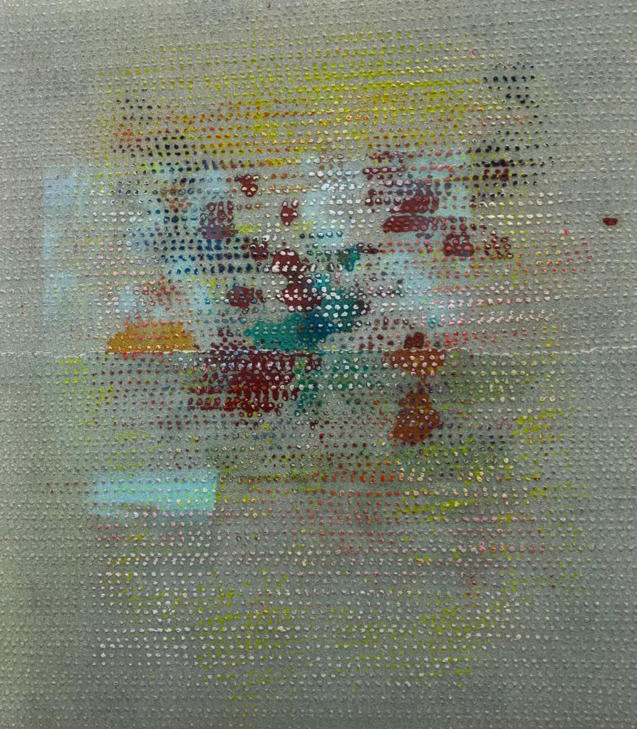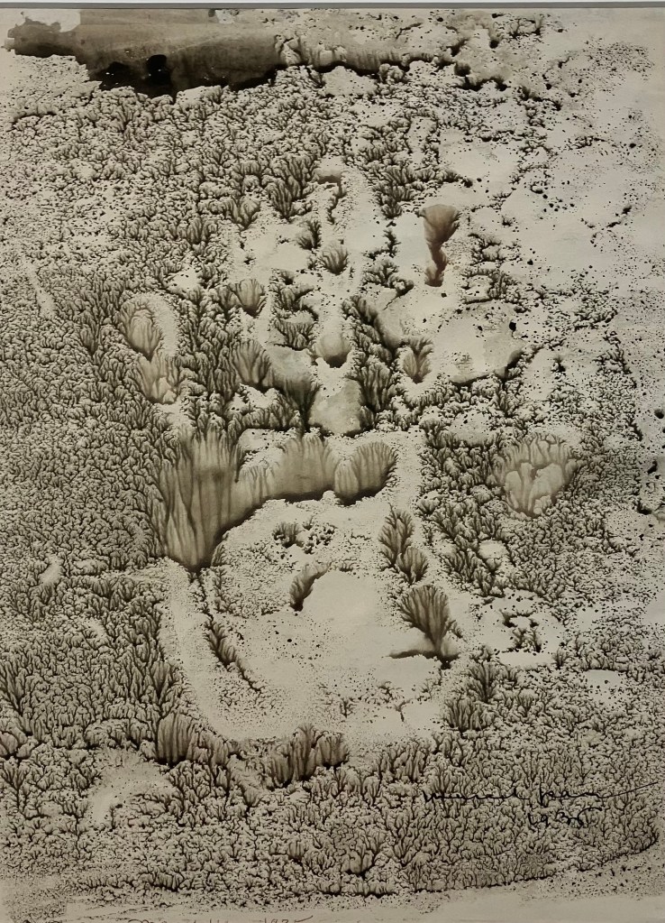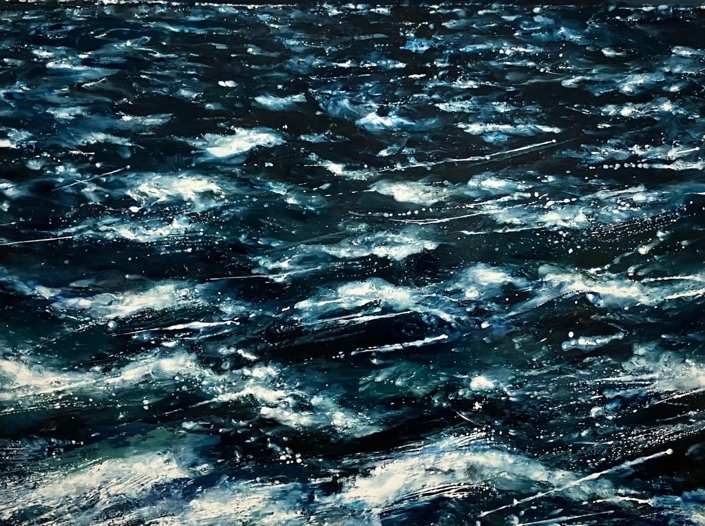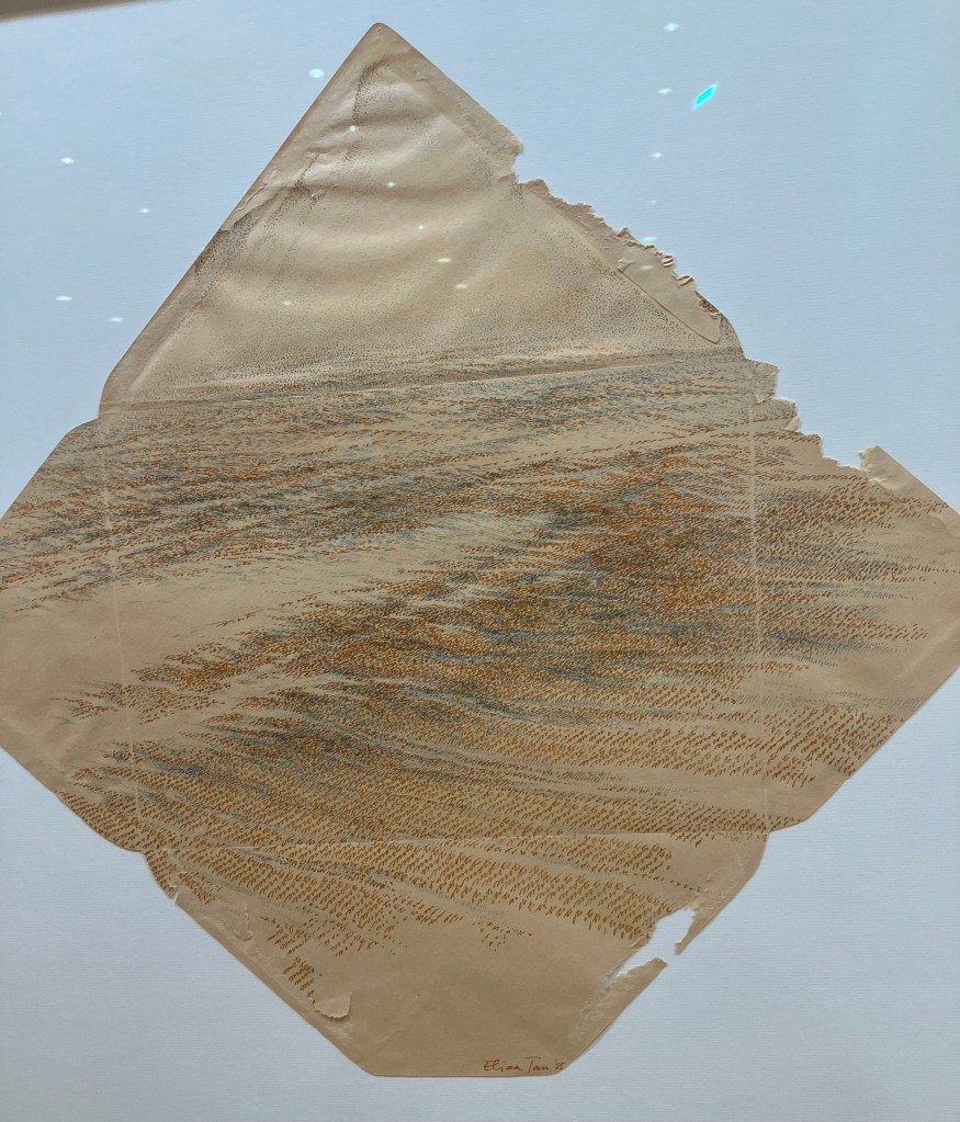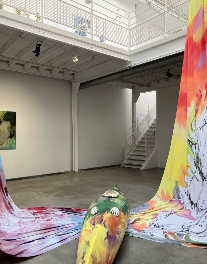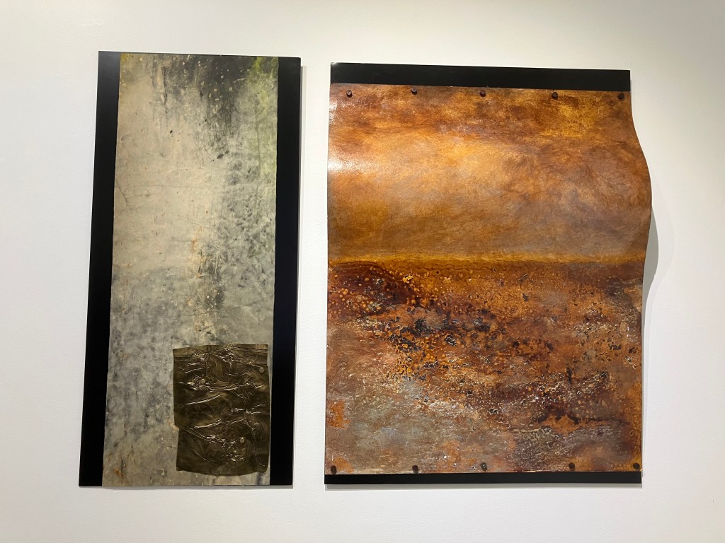 donnait envie d’en savoir plus .Jardin des souffles est présenté jusqu’au 19 avril .Peintures à la tempera sur résines ,sur fragments d’épaves trouvés en Méditerranée ,sur papiers artisanaux , changements d’échelles ,explorent les liens entre l’humain , la nature et le spirituel .