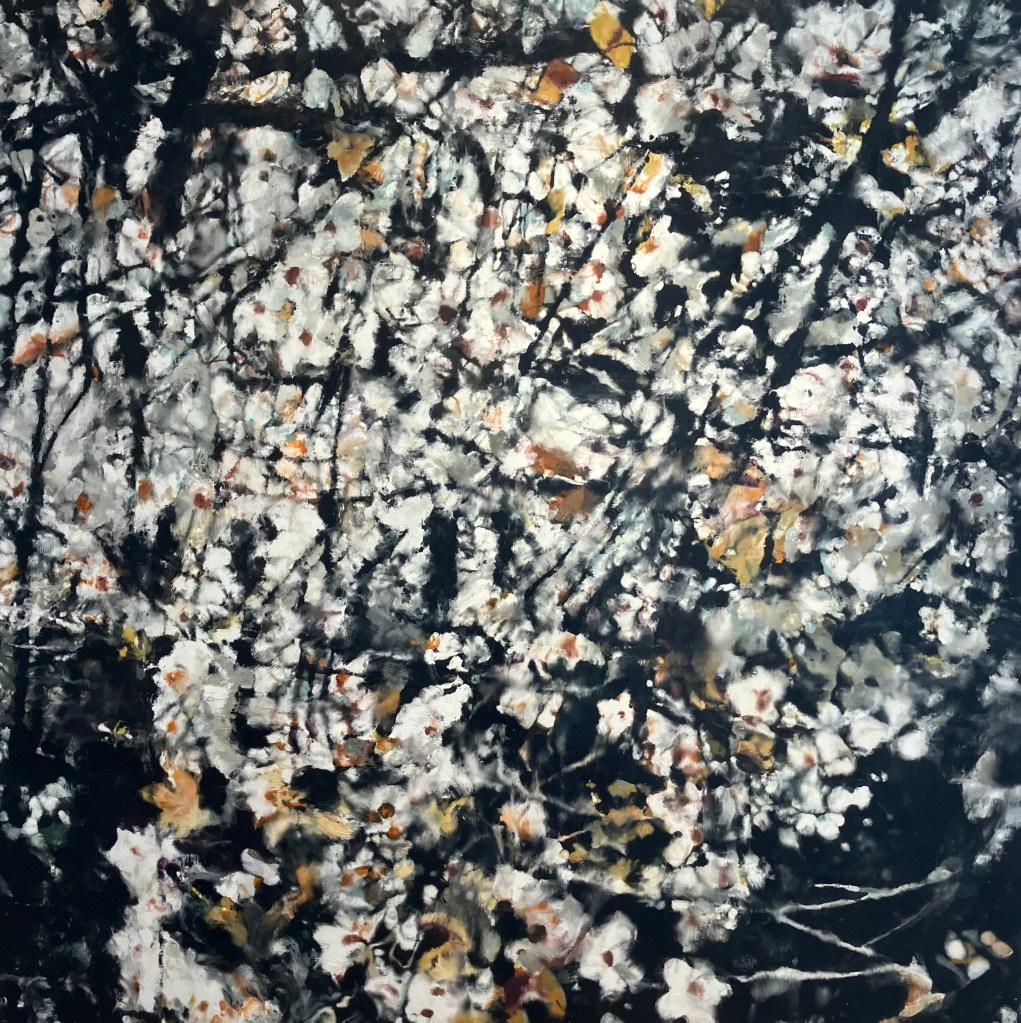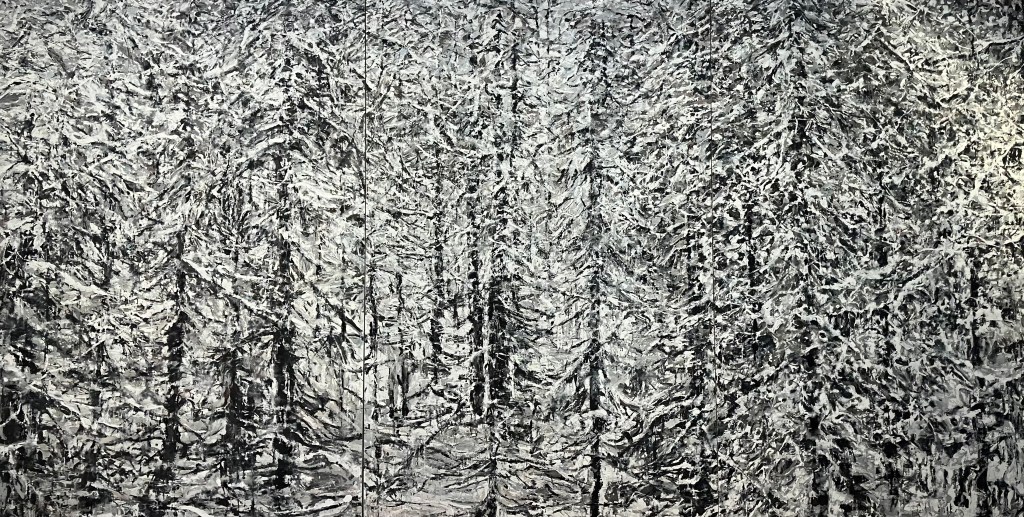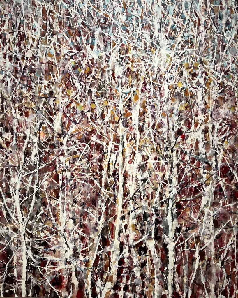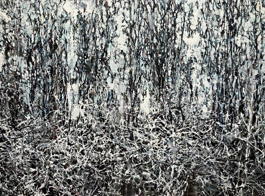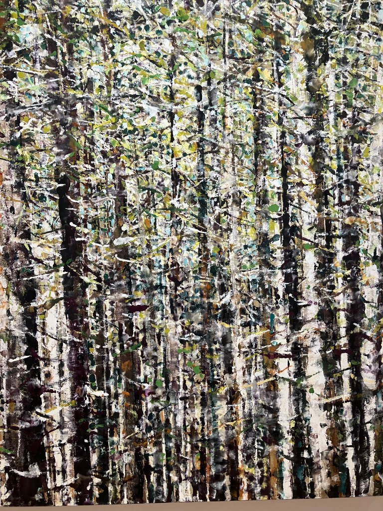 Rue du Grenier Saint Lazare , on retrouve avec plaisir jusqu’au 10 mai la belle technique à la cire de Philippe Cognée , dans ses paysages fragmentés , forêts, paysages maritimes ,ou enneigés , toiles grattées , diluées , en dripping .