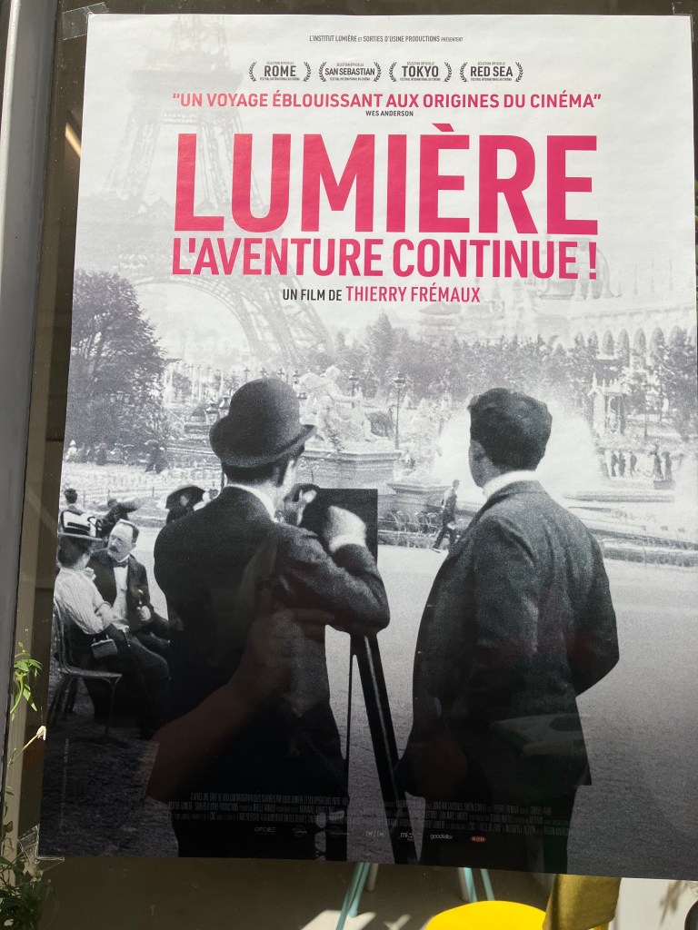 Je suis aussitôt attirée par l’ affiche , dans la vitrine , de ce film remarquable qui rend un hommage sensible et documenté aux inventions des techniques cinématographiques des frères Lumière: travellings avant et arrière, mouvements de foule , cadrages , et des genres : le burlesque , la guerre, la comédie , le documentaire … un pur ravissement esthétique et intelligent .Je le recommande à tout le monde !!!