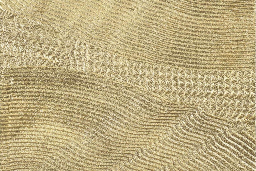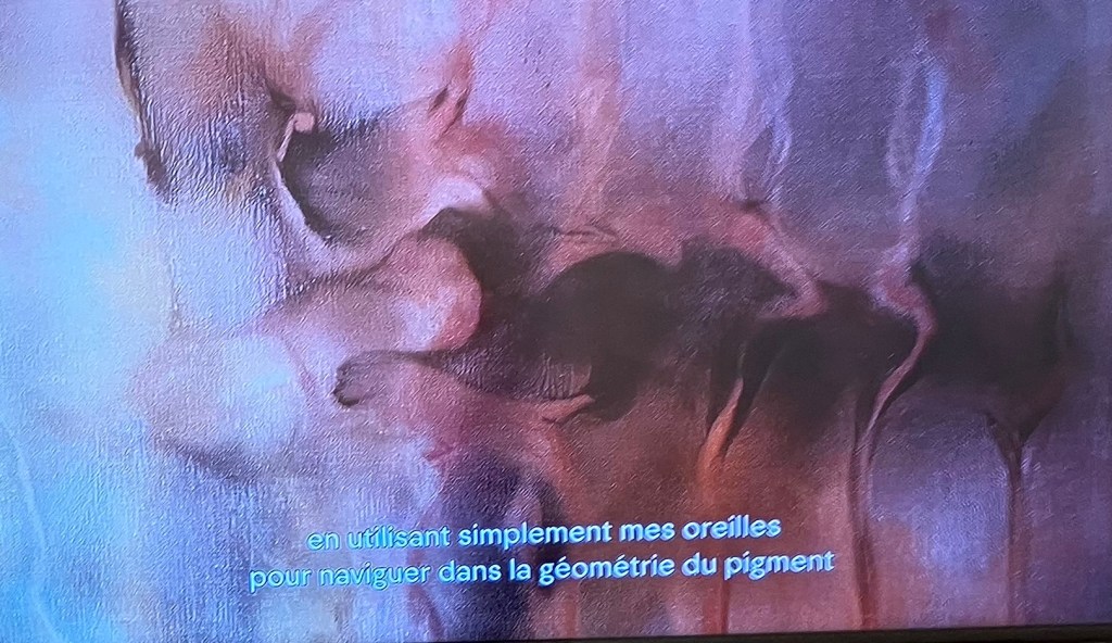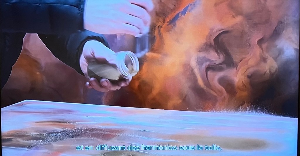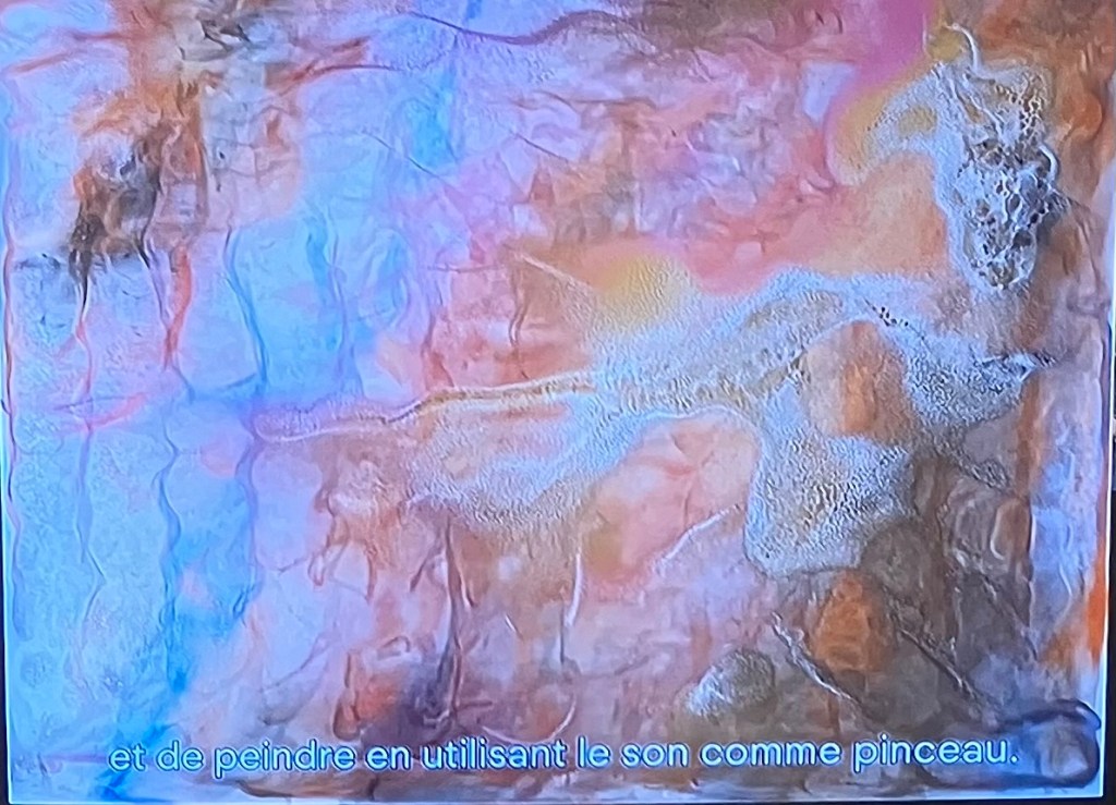 Ici il travaille avec des pigments déposés sur supports horizontaux .Il passe de la musique , et ce sont ondes et vibrations qui vont se faire déplacer les pigments et créer les oeuvres .Le son est utilisé comme pinceau .