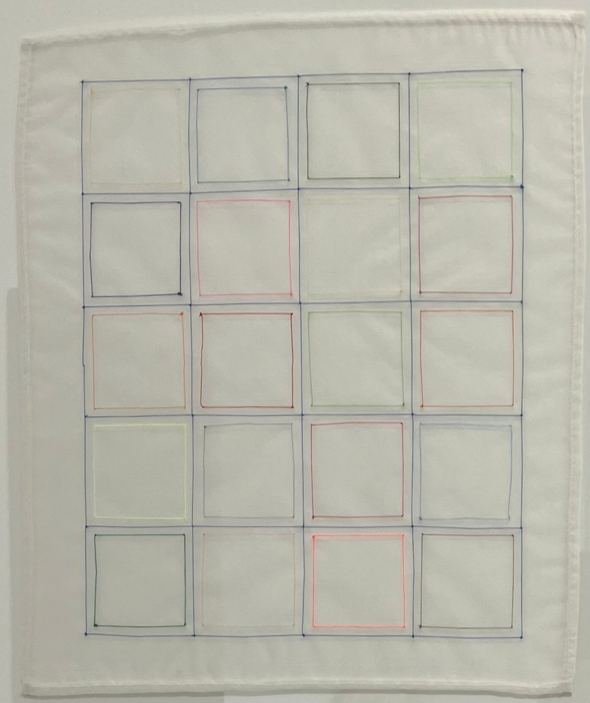 On monte au 2 ème étage . Et on remarque à chaque étage des toiles suspendues , aux motifs géométriques qui rappellent ceux utilisés pour subdiviser les vitrines.