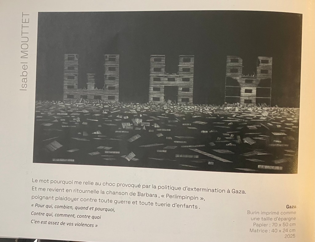 Aquatinte,burin, pointe sèche,eau-forte, xylographie, vernis mou , carton gravé, manière noire , carborundum,couture , beaucoup de techniques, de formats ,de supports ( feuilles de mûrier, marouflage, feutre, ) de styles , de sujets , de réflexions .Pour comprendre le lien entre chaque gravure et la thématique , pas de panels , hélas, mais on peut visiter en empruntant le petit catalogue qui nous donne connaissance de ce que chaque artiste a écrit . Autre problème : les reflets , très pénibles , on ne voit même plus la très belle oeuvre de Gatti . Certains artistes ont été assez avertis et astucieux pour que cela ne se produise pas .l’exposition est magnifique pleine de créativité , de finesse , de subtilités .